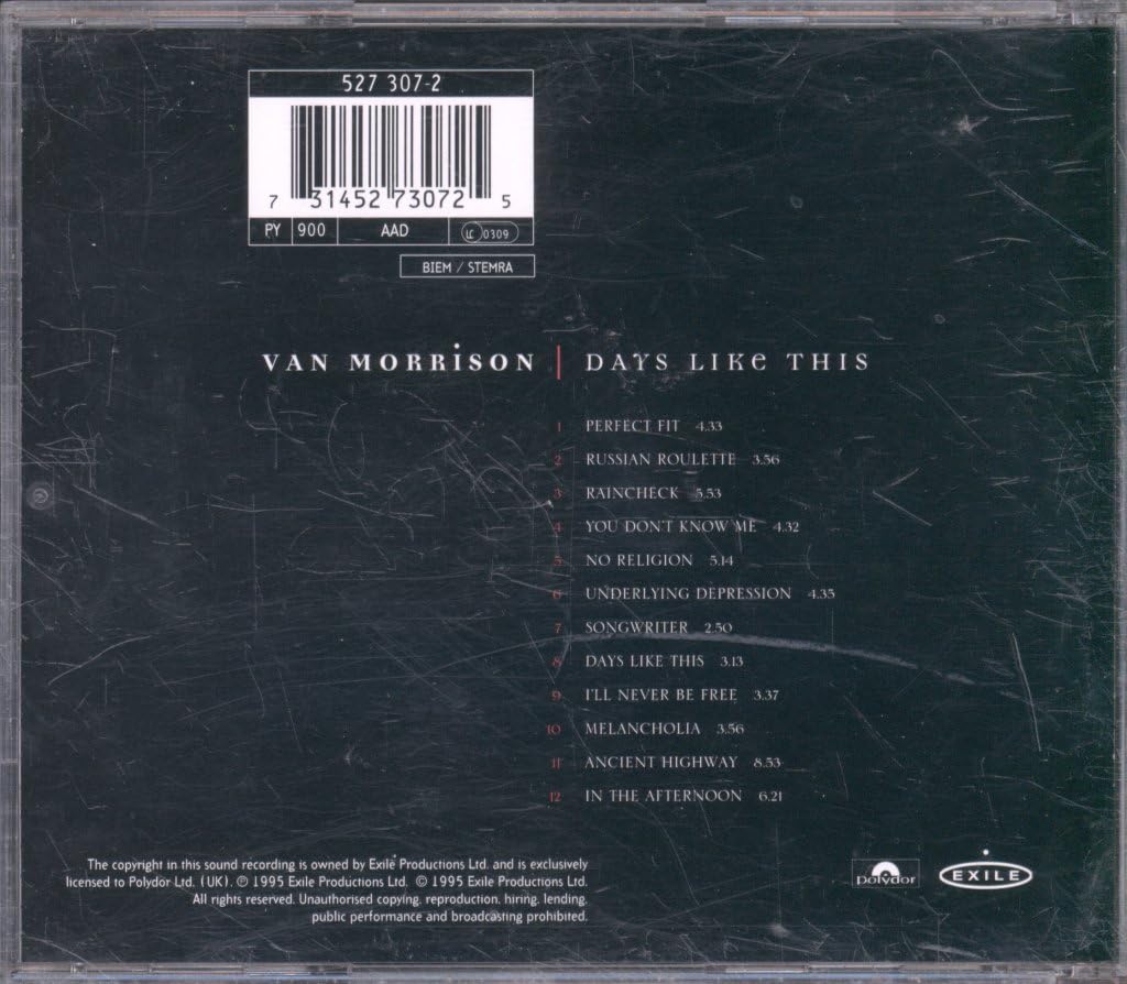 Amazon.com In an era when most old rock stars are left to recycle their greatest hits for megatours and MTV Unplugged, it's refreshing to know that Van Morrison still pours on all the originality and wit he had when he made Moondance. On Days Like This, Morrison continues his lifelong exploration of the human psyche, offering up highly entertaining and danceable (yes, danceable!) tunes about everything from love to manic depression. As always, Morrison's vocals rumble along through intelligent lyrics, plowing up a range of emotions almost too numerous to catalog. Needless to say, the sweet, soulful harmonies of Morrison's adroit backup singers and Pee Wee Ellis's fabulous horn arrangements serve as fabulous counterpoints to Van the Man's energetic and pointed performances. When all is said and done Morrison sums it up best in "Songwriter," a self-effacing ditty about the job he has done, and still does, so very well. --L.A. Smith Product description Van Morrison - Days Like This - CD