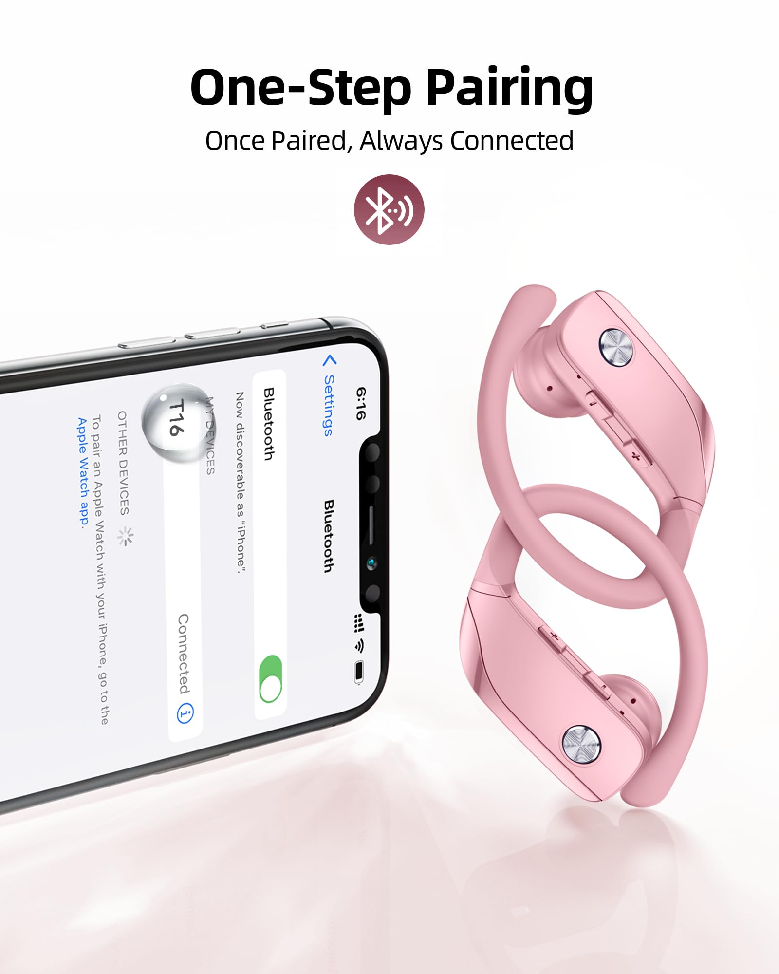 Seamless Bluetooth Connection & Easy Controls: With advanced Bluetooth technology, the T16 ensures faster pairing, lower latency, and a stable connection across multiple devices. Simply take the ear buds out of the case to auto-pair with your last connected device. Separate control buttons prevent mis-touches—volume and playback are intuitive and effortless even while running or training.