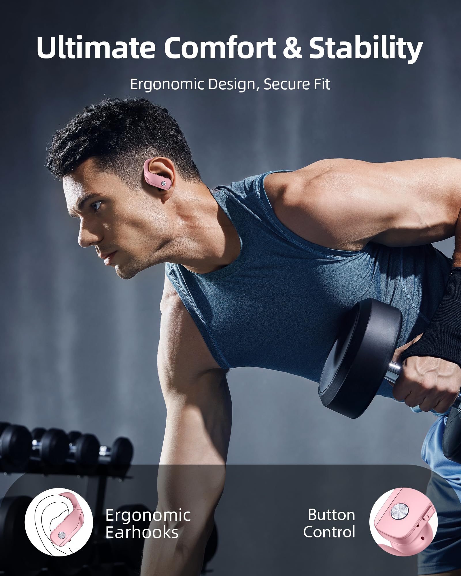 Secure Fit & All-Day Comfort: Designed with flexible ear hooks and soft silicone ear tips (S/M/L sizes), these bluetooth earbuds stay securely in place even during intense workouts. The ergonomic design naturally adjusts to different ear shapes for a pressure-free, stable fit. Ideal for all-day wear, the sound-sealing ear tips enhance bass and help block external noise for a more focused listening experience.