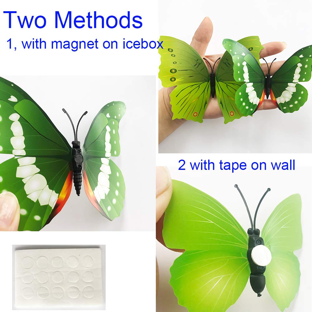 Totally 36 pcs different models 3D butterflies, 4 colors and 2 styles to choose. 4 colors: Green, blue, red and yellow, 2 styles: single wing and double wing; Size and material: pls check the pictures for each size, PVC material, Comes with adhesive to help attach to the wall.Each wall stick with magnets and glue; A perfect gift for any special occasions like Christmas, wedding, birthday, anniversary,engagement, new baby; With magnets, can stick on refrigerator, with glue tape, can stick on the wall, mirror, tile and wood surface; We are devote to provide happy shopping experience for our customers.If you aren't completely satisfied with our we will give you a new replacement.