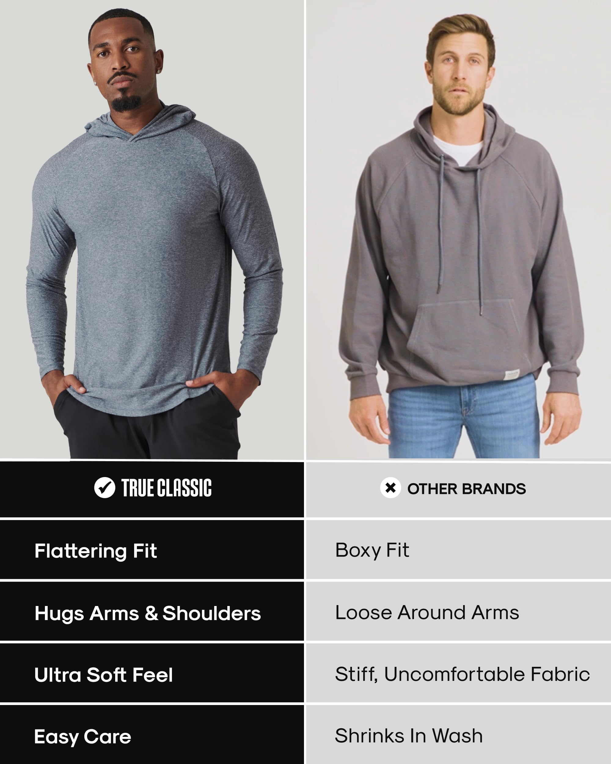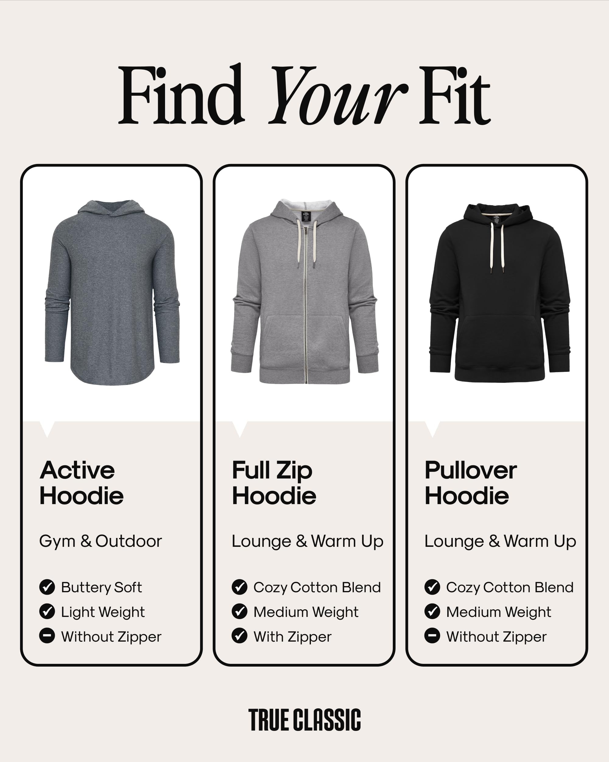 Description Built for comfort, made to move, and styled to fit—True Classic hoodies deliver the “fits perfect” feel customers call out. This collection of hoodies for men includes our performance Active Hoodie, a classic pullover hoodie, and a cozy zip-up sweatshirt. The Active Hoodie uses a smooth 96/4 performance blend that wicks moisture, dries fast, helps control odor, and adds UPF 30 sun protection (white rated UPF 15), so your hoodie stays comfortable during training, travel, or anytime you’re on the go. Prefer plush? Our French-terry pullover and zip-up mens hoodies are brushed inside and out for a soft, warm hand feel—easy to layer, easy to live in. Each hoodie features an athletic fit that’s true to size and designed to move with you without feeling baggy or tight. Clean details—tagless labels, side seams that hold shape, durable stitching, and functional pockets—make these men’s fashion hoodies & sweatshirts simple to style Monday through Sunday. Available in S–3XL and go-with-everything colors like plain black hoodie, navy/dark blue hoodie men need, carbon/charcoal heather grey hoodies men love, and military green mens hoodie (varies by style). Wash cold and dry low; expect minimal shrinkage so your favorite fit stays the favorite. Choose your True Classic hoodie, pull it on, and head out feeling comfortable, covered, and ready for whatever’s next.