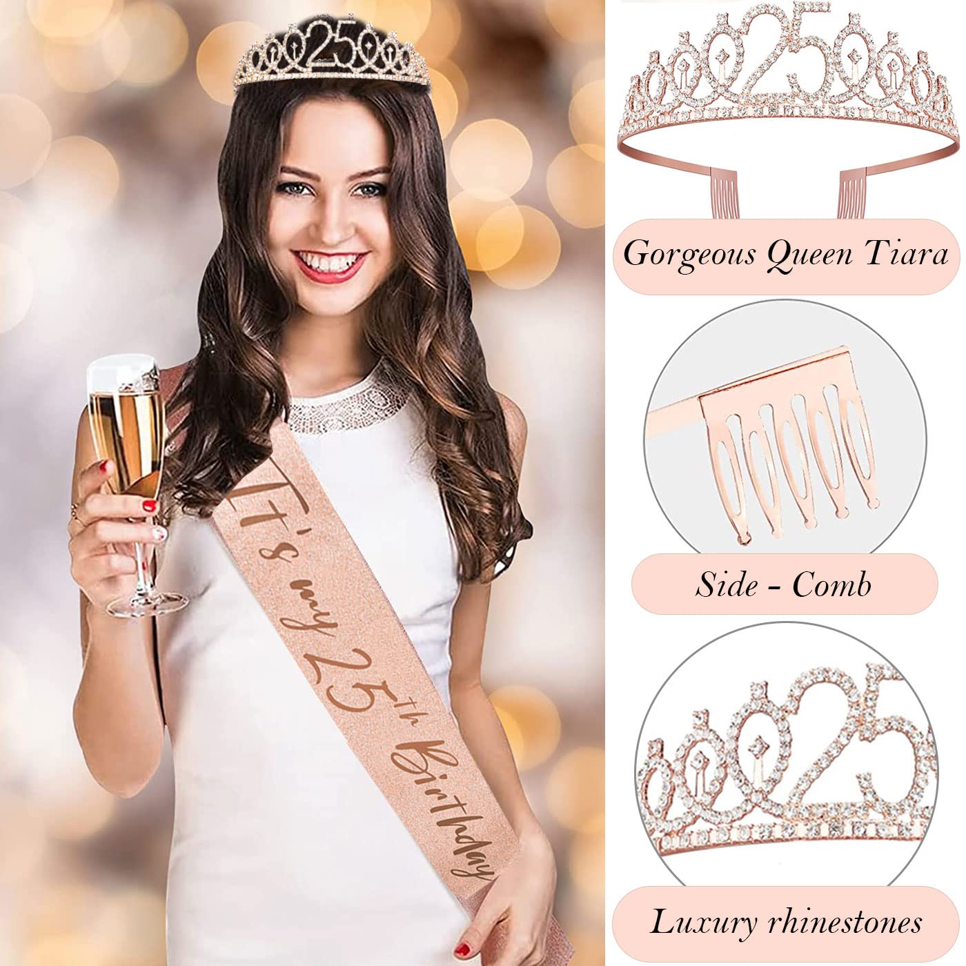 Glittery Rose Gold Crown 25: Made of high quality alloy and rhinestone. 25th Birthday Tiara is with combs that make sure it can grip the hair more tightly for fitting girls. Dimension: 5.4” on the front side.