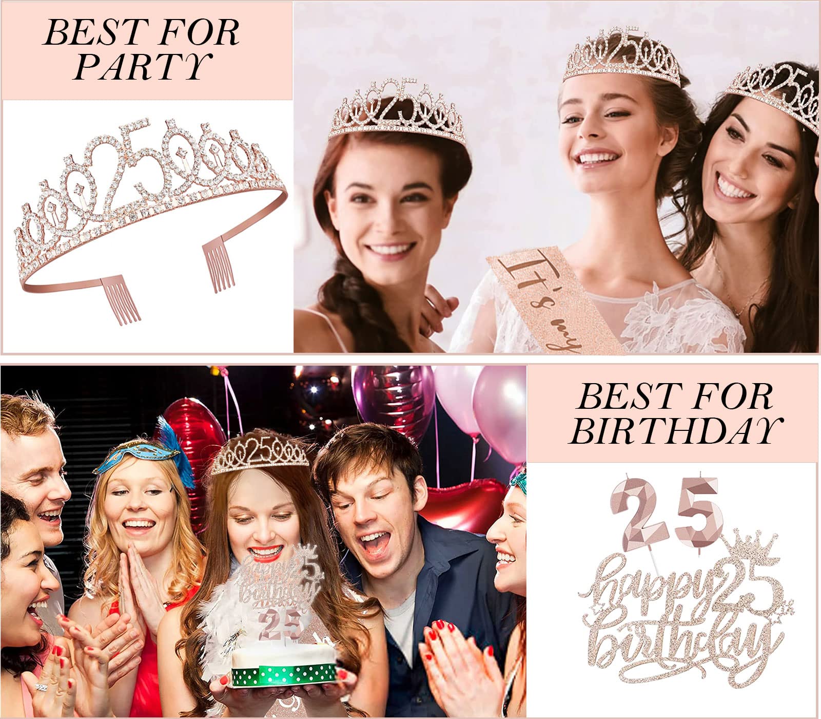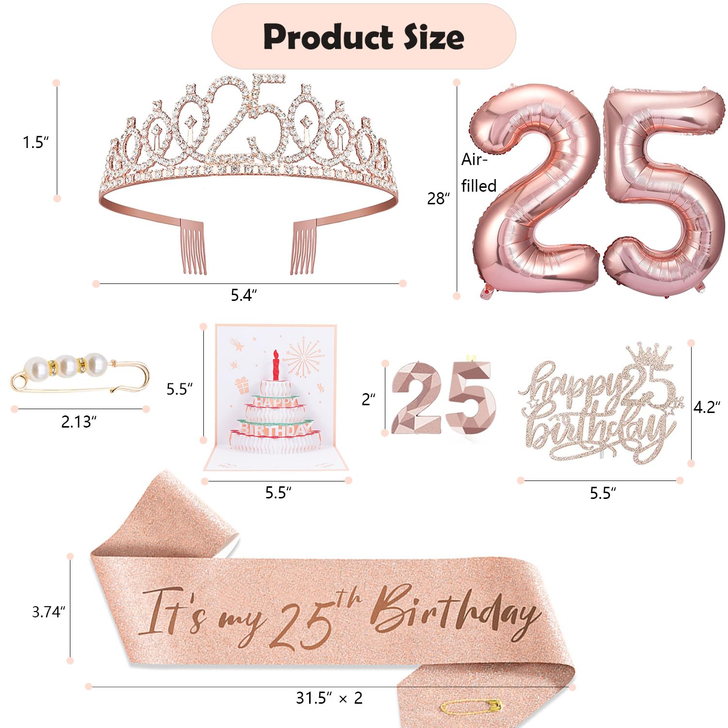 25th Birthday Decorations for Girls: Glittery 25th tiara/crown *1pc, “It’s my 25th birthday” sash *1pc, Happy 25th birthday cake topper *1pc, pearl pin*1pc, 2+5 numeral candles *1set, 2+5 numeral balloons *1set, they are exquisitely packaged in the carton.