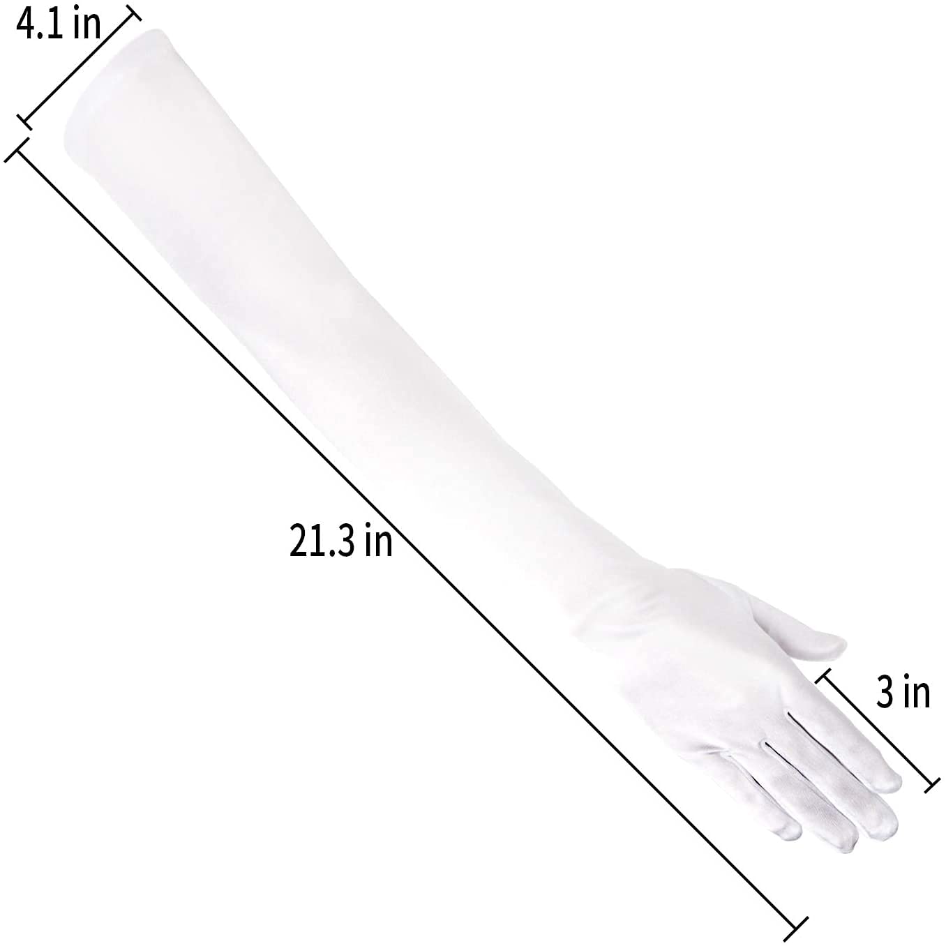 Perfect Size:Satin gloves are 21 inches in length from fingertip to the end.Finger length is 3.2 inch.Fit you hands perfectly and never fall down.Not too tight or too loose.One size fits all with stretchy.