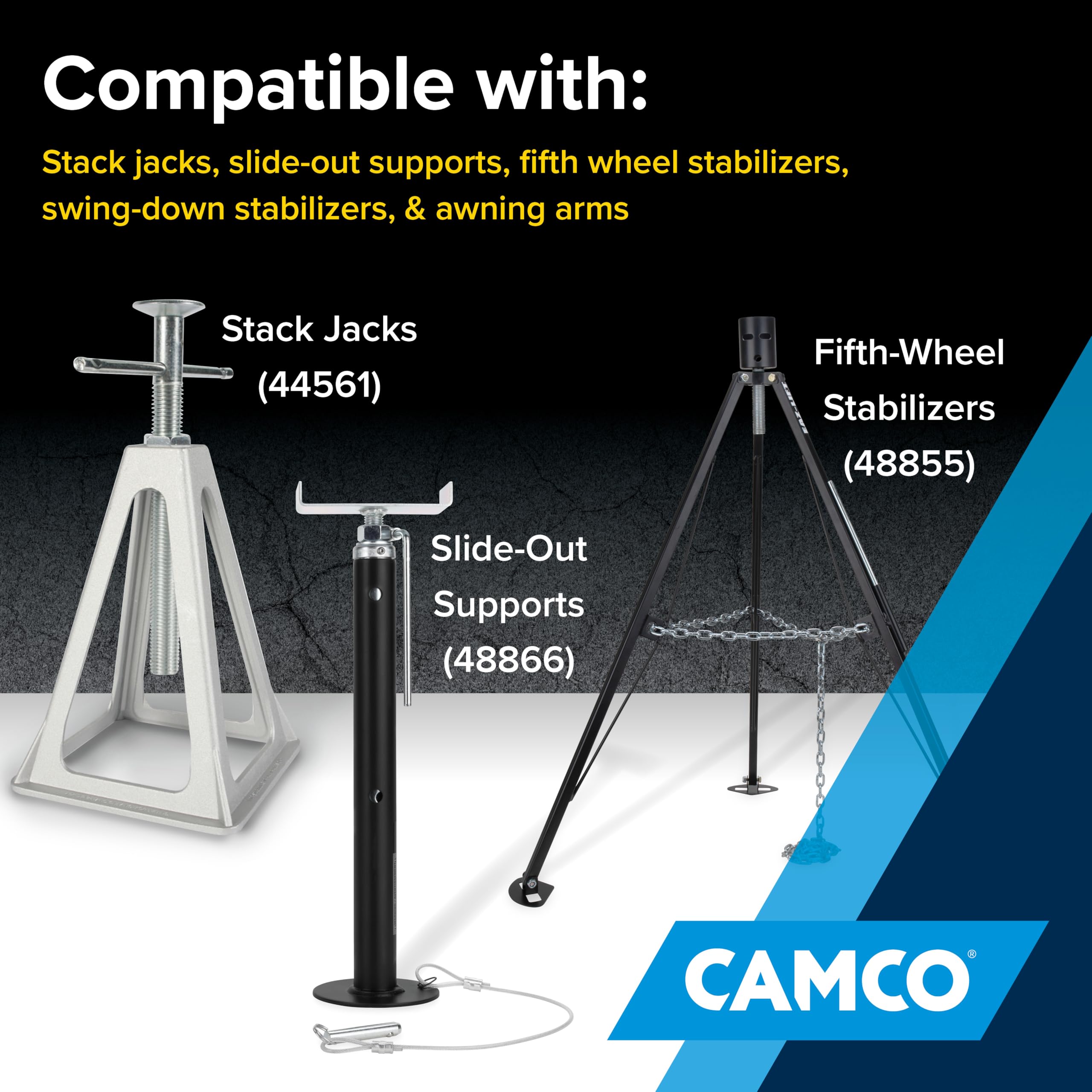 Compatibility: This RV accessory works with stack jacks, RV slide-out supports, fifth wheel stabilizers, swing-down stabilizers, and awning arms. It is not intended for hydraulic jacks.