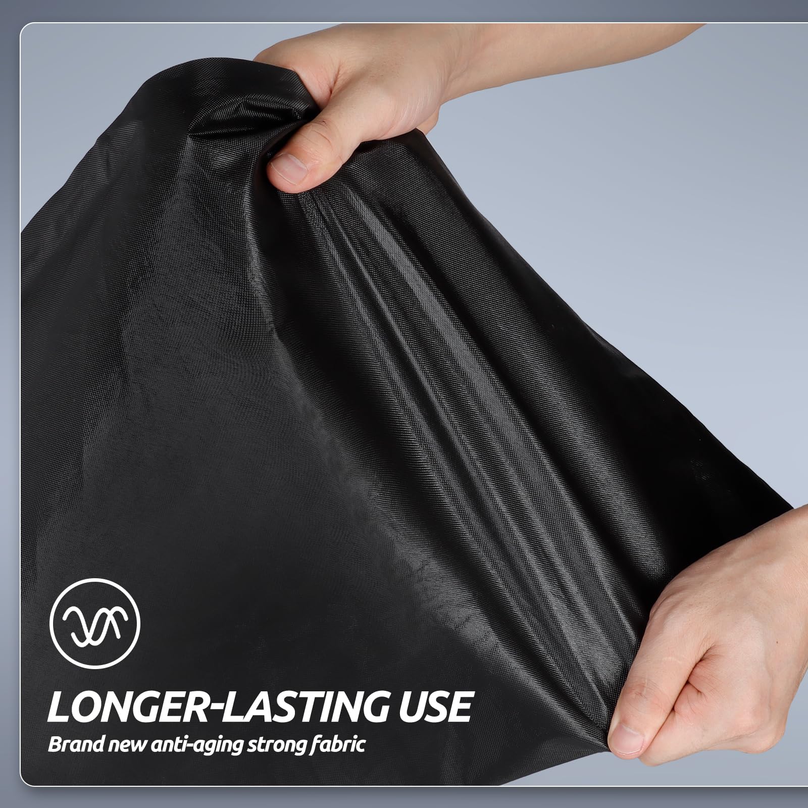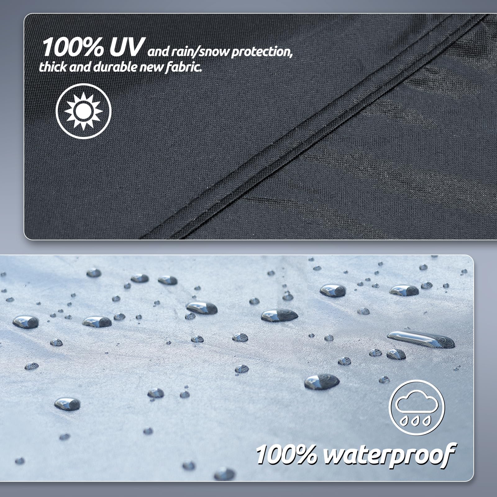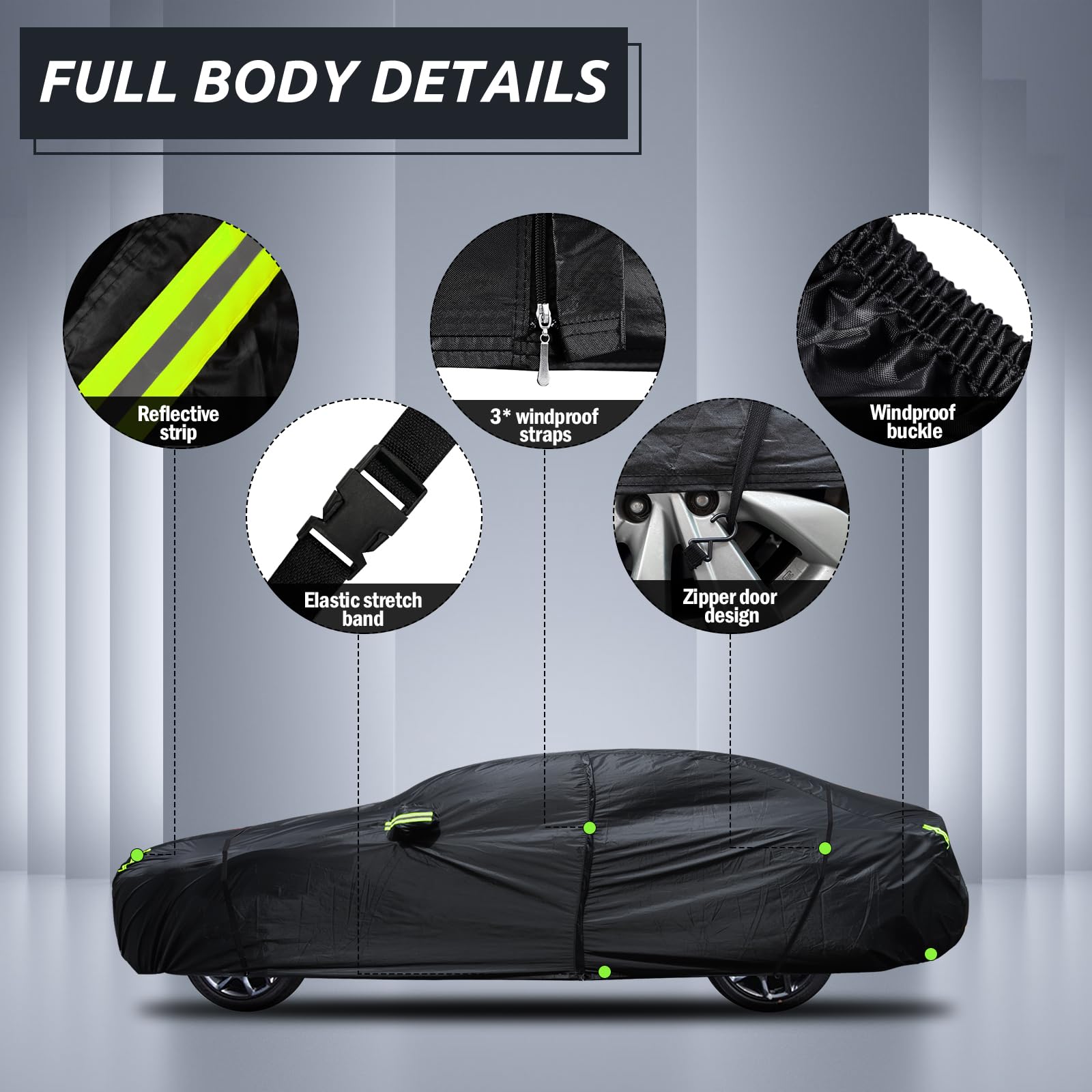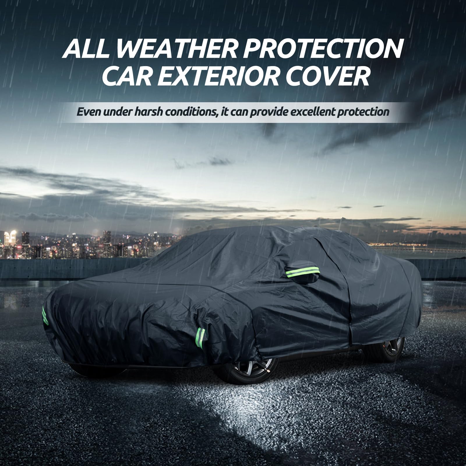【Wind-Resistant Design】The car cover waterproof all weather has been specially designed to resist strong winds. ① Equipped with two bungee cords, which only take a few seconds to tie to the tires on both sides, it securely covers the front and rear of the car. ② There are specially designed windproof straps at the bottom to pass through the car's middle to ensure that the cover is not blown away. ③ The adjustable elastic hem makes it easy to adjust the size and fix the cover to the car body.