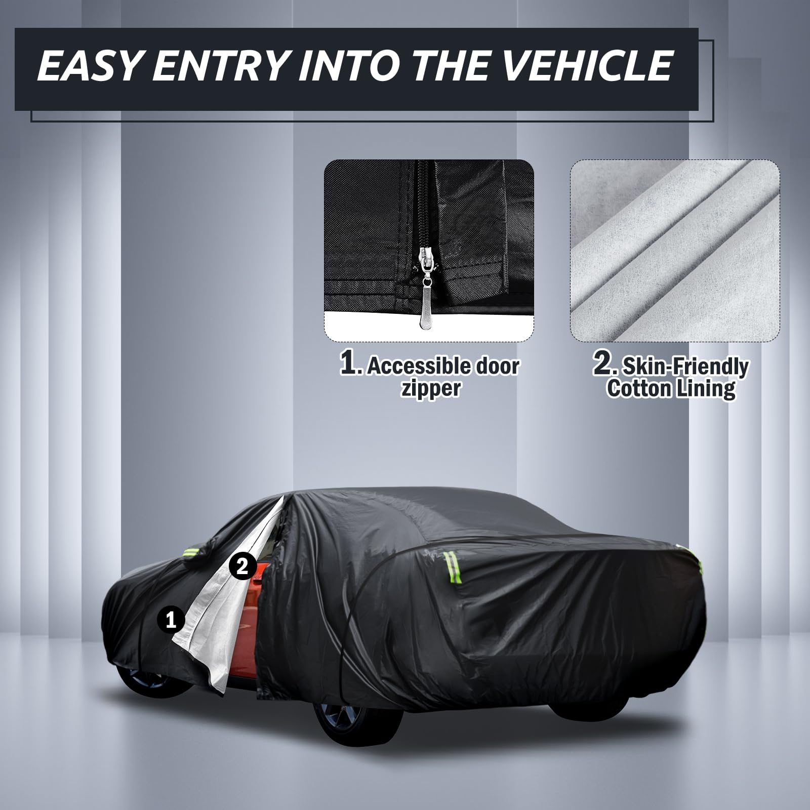 【Safety and Convenience Design】 ① The driver's position of the Migaven full exterior covers has a zipper, which allows you to enter the car at any time to retrieve items without removing the cover. ② Equipped with six reflective stripes, the full-coverage reflective stripes remind others at night to ensure parking safety. ③ The cover is equipped with a mirror pocket to protect your mirrors perfectly and avoid damage. ④ It comes with a storage bag for easy placement.
