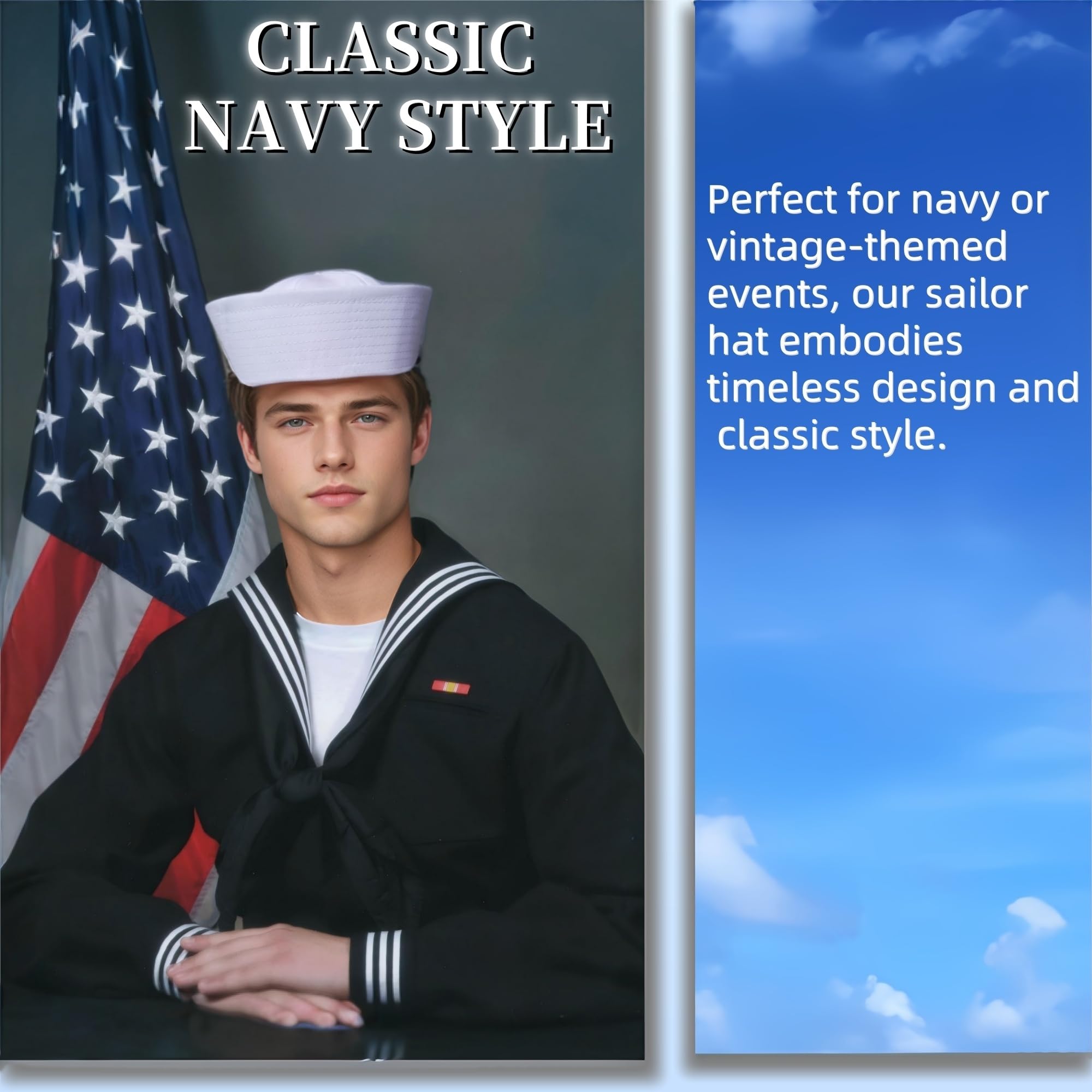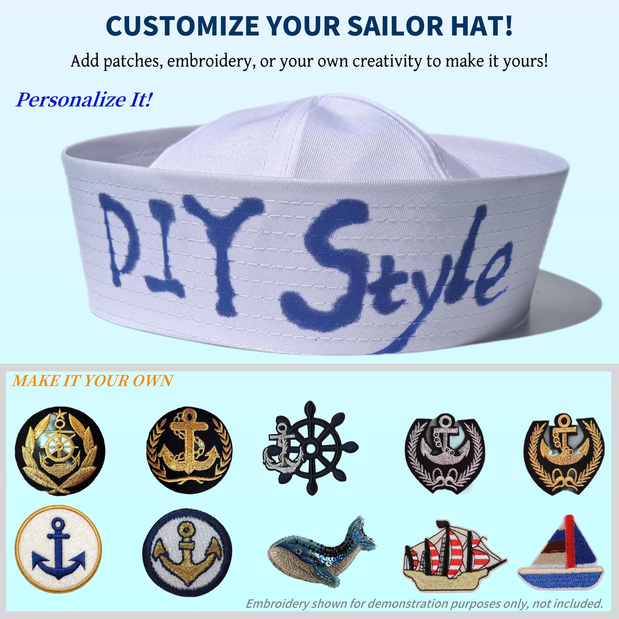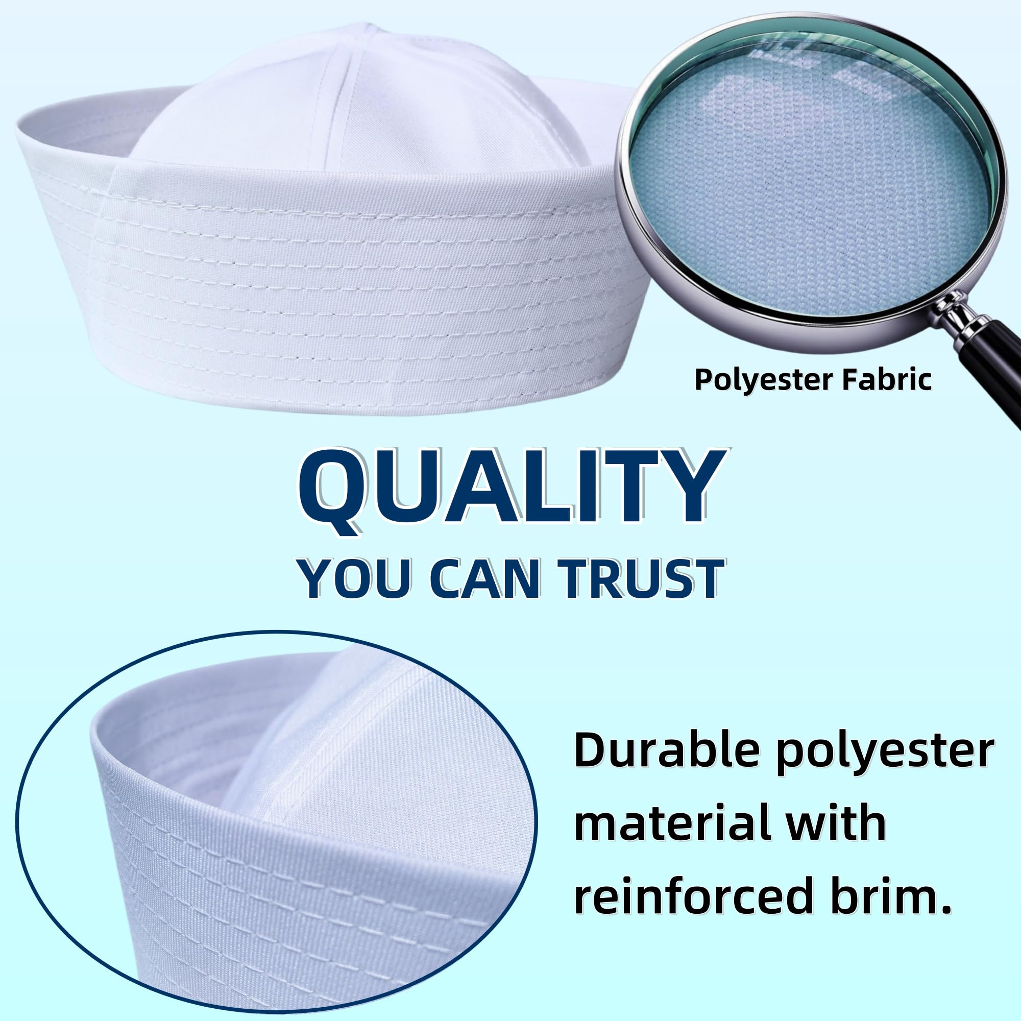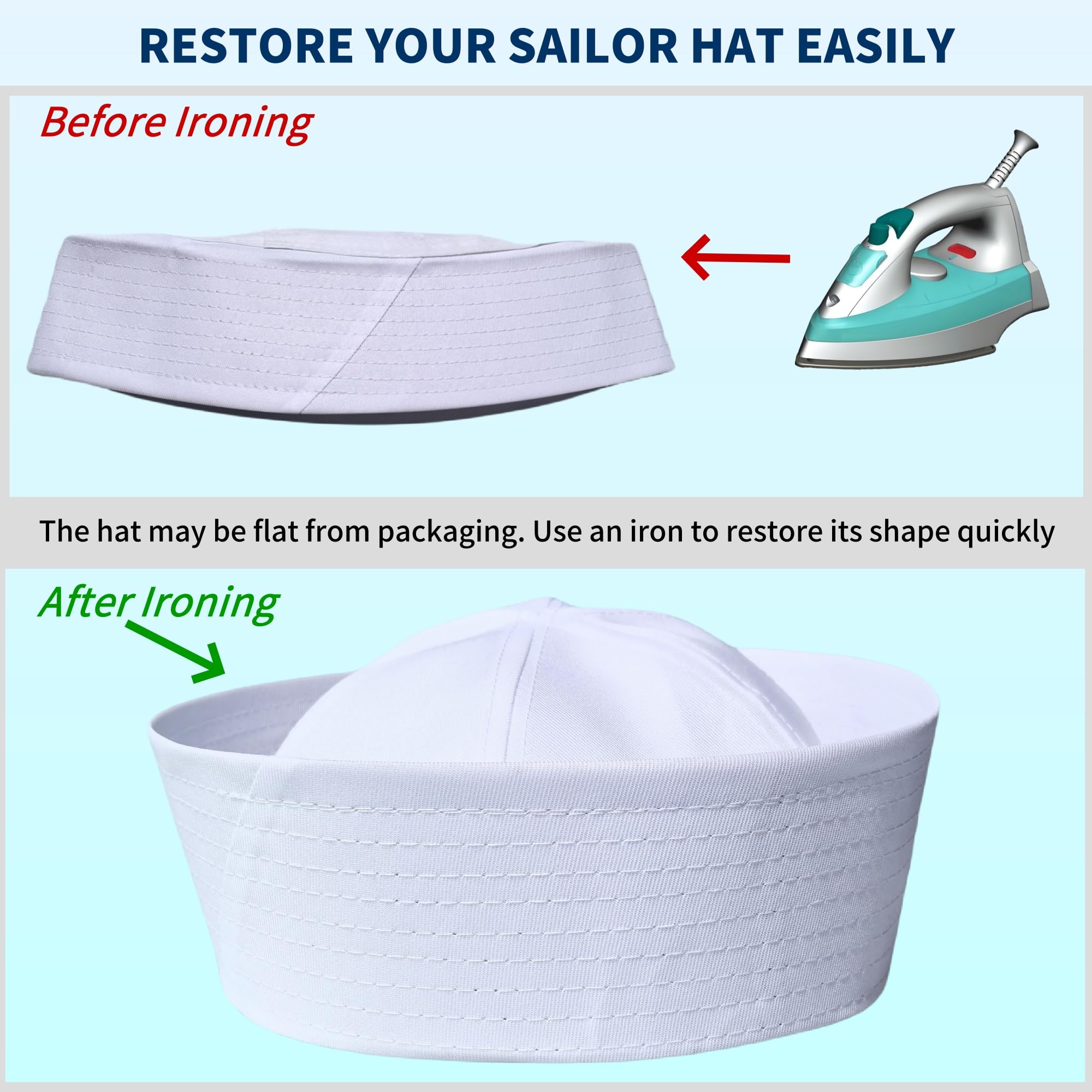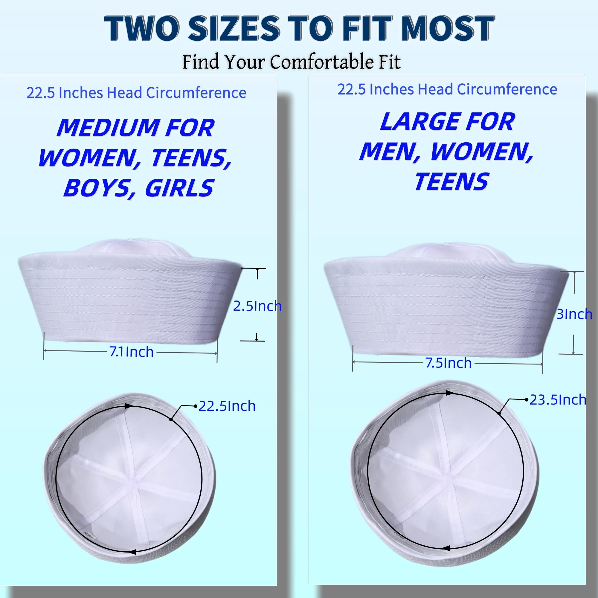 His Large Sized Sailor Hat has a 23.5" Inner CircumferenceοΌ7.5" in diameter and the brim is 3" tall. Fits Most Adults and Teens