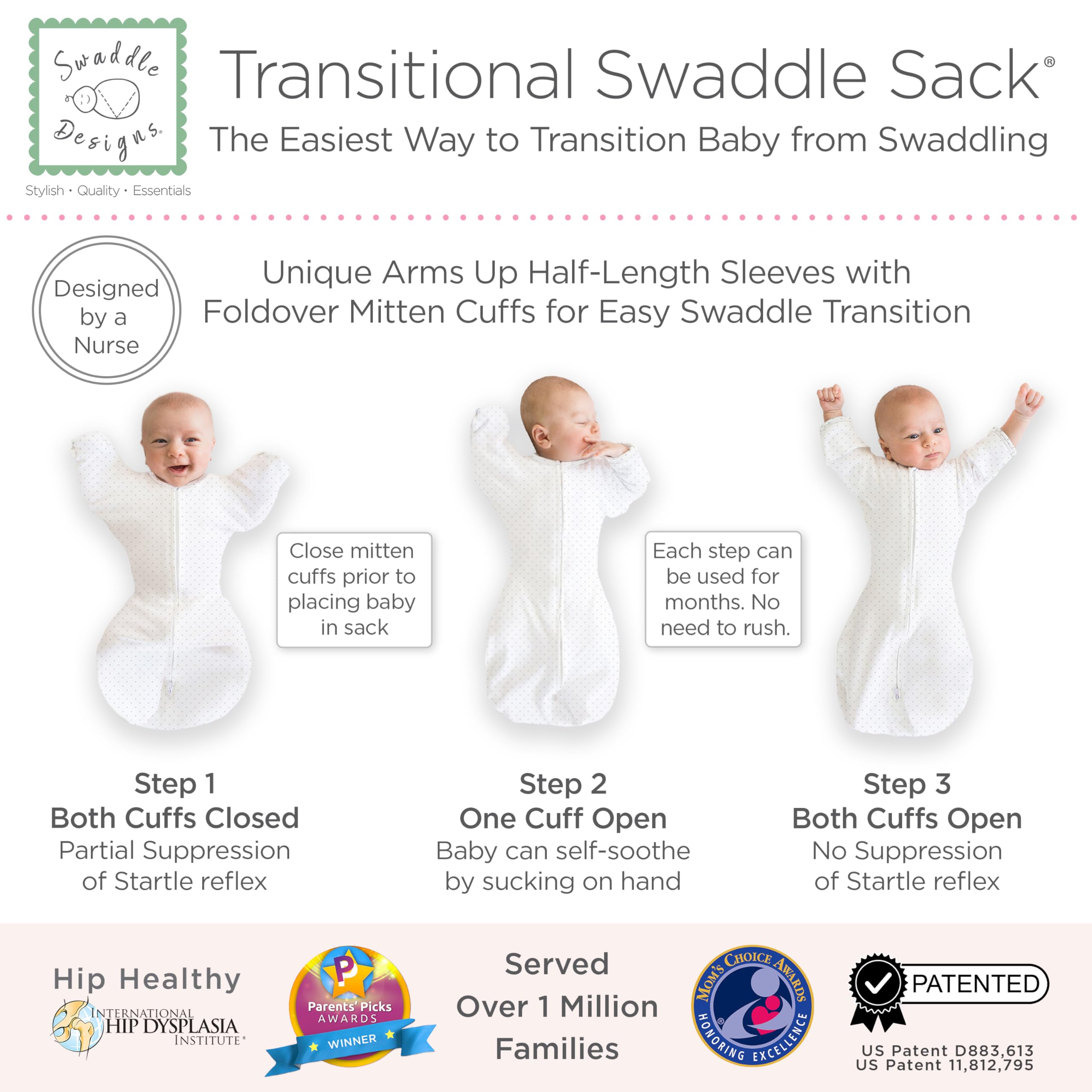 The Transitional Swaddle Sack is the easiest & safest way to transition baby from a traditional swaddle. The arms up sleeve design allows baby to self-soothe and the unique ½-length sleeves with foldover mitten cuffs closed provide partial suppression of the Startle Reflex to promote better sleep; and, if baby rolls over during sleep, the sleeves allow baby to use arms to lift torso and head to access air to promote safer sleep. The Transitional Swaddle Sack is ideal for babies who prefer to sleep with arms up, babies who are starting to rollover, and babies who break out of a traditional swaddle. The uniquely-shaped, ½-length sleeves are not full length, so when mitten cuffs are closed, baby’s arms will be flexed close to body for swaddle snugness. The foldover mitten cuffs may be worn open or closed. Caregiver can open one or both cuffs, so baby can self-soothe by sucking directly on hand. Helpful 2-way zipper with 2 zipper pulls. The zipper zips down from the top to make it easy to place baby in the sack and zips up from the bottom to make it easy to change baby’s diaper. Designed by a nurse. 100% Cotton. Soft, stretchy cotton knit. 0.7 TOG. Machine wash warm and tumble dry low. US patents 11,812,795 & D833,613 with patents in EU, UK, CA, CN, JP and other countries.