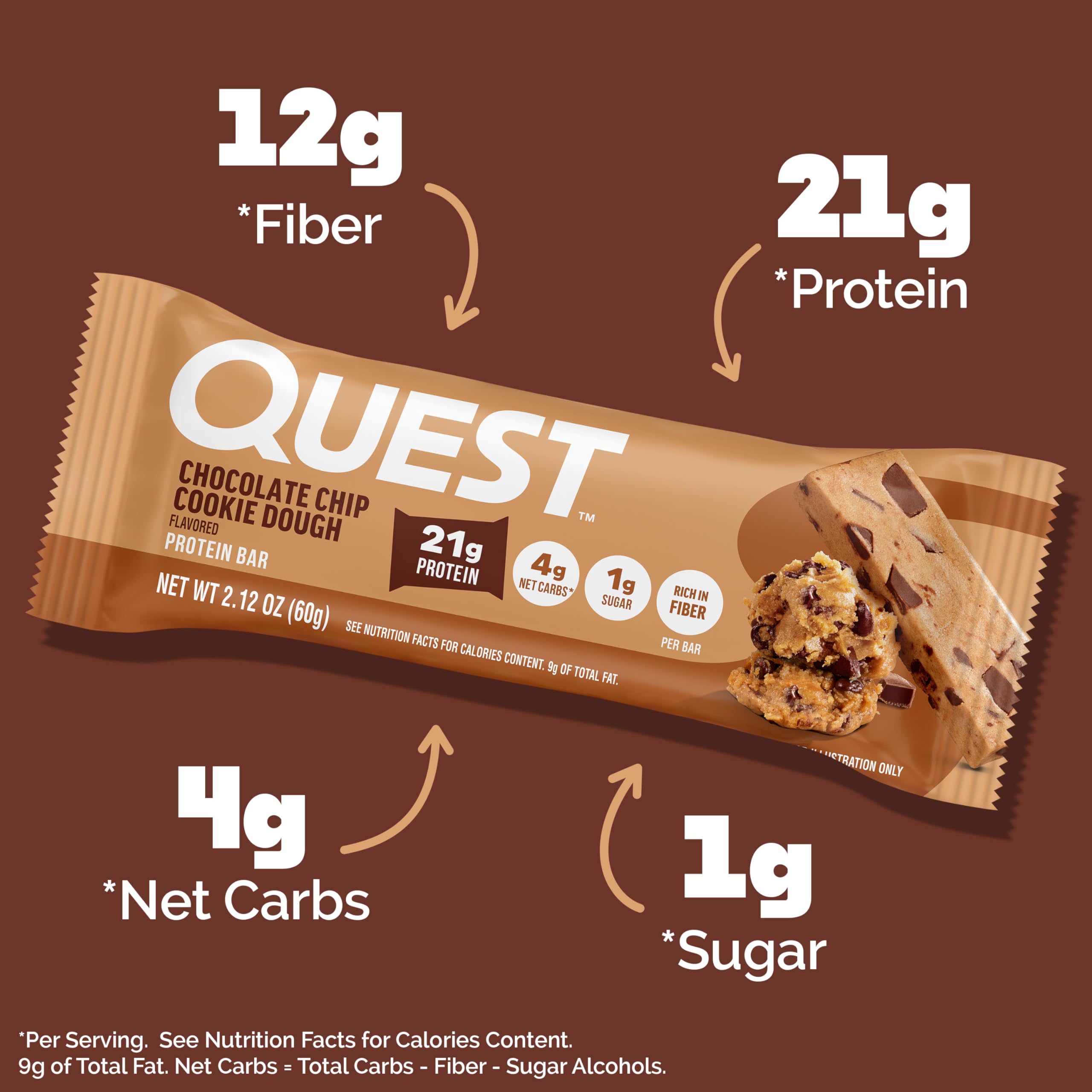 AT HOME OR ON-THE-GO. Quest Chocolate Chip Cookie Dough Protein Bars with 21g of grab & go protein are just right for your morning commute, as a tasty treat at your desk, or a delicious way to refuel after a workout.*