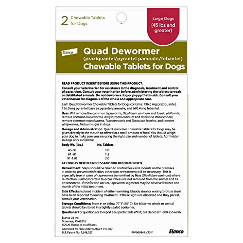 Quad Dewormer for Dogs is a broad-spectrum dewormer that removes common intestinal parasites with a single dose.* Quad Dewormer is effective against roundworms, hookworms, tapeworms and whipworms in dogs over 4 weeks old. *Steps should be taken to control fleas and rodents on the premises in order to prevent reinfection; otherwise, re-treatment will be necessary. Consult your veterinarian for assistance in the diagnosis, treatment and control of parasitism.