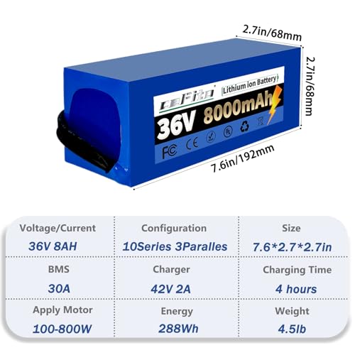 【36V Ebike Battery】The 36v lithium battery with 42V 2A fast charger, size:7.6*2.7*2.7in, weight:4.5lb. The 36v ebike lithium battery is compatible with 100-800W motors for daily commutes or long rides