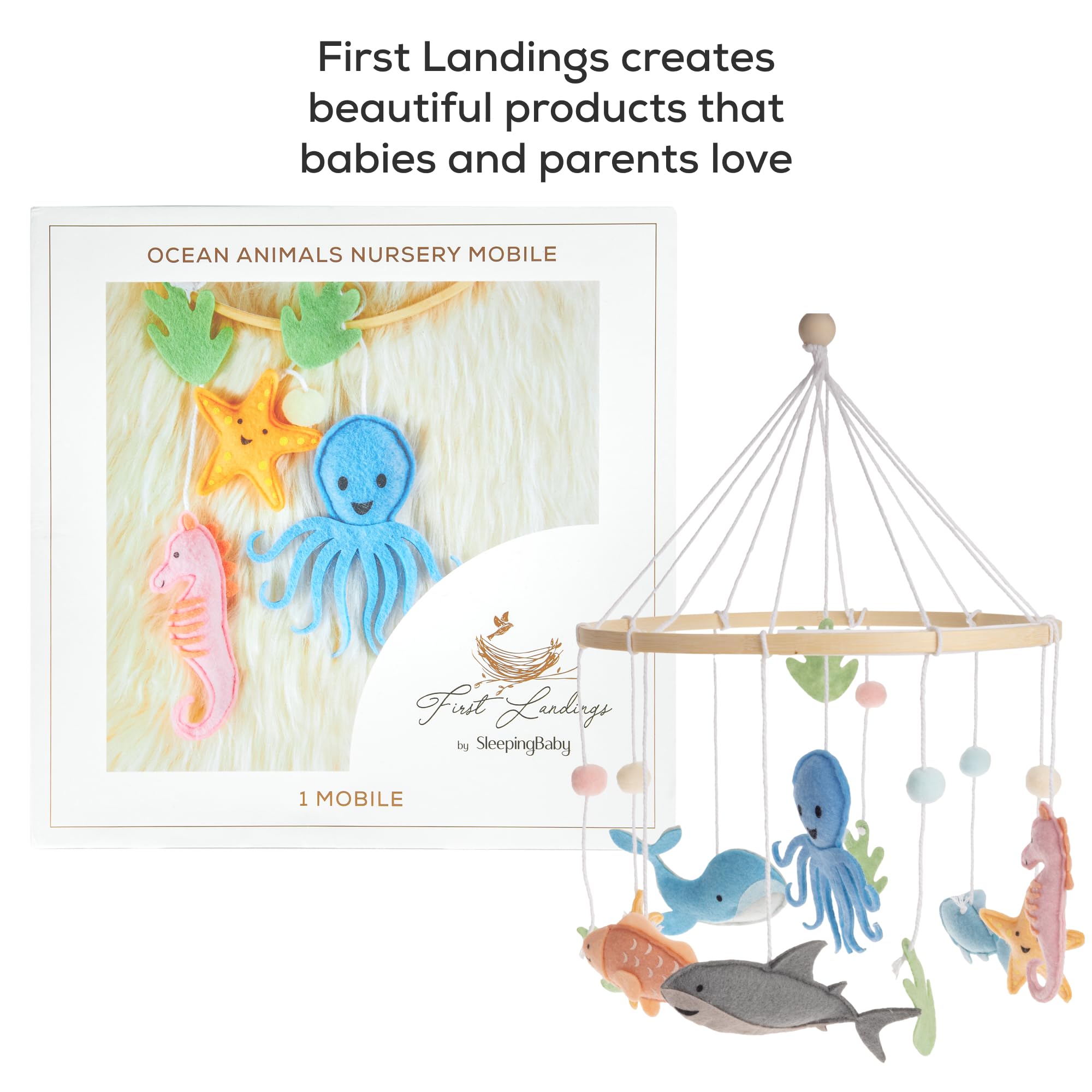 Complement your Ocean decor and complete your dream ocean nursery with First Landings's ocean baby mobile. Our ocean mobile for crib is the perfect accessory for a nursery full of forest themed baby stuff. Our adorable, minimalist mobile animals are designed with gender neutral color tones that make as great of a crib mobile for boys as it would a crib mobile for girls; unisex décor that will look good in the children's room of a boy or girl and perfectly match their bedding and accessories. Looking to find a unique, must have baby shower gift not already on the typical baby registry? Searching for fun baby reveal ideas or baby announcement props? This ocean mobile makes a great gift for every new mom and new dad! First Landings is a small, family-run business located in the USA. We set out to design a higher quality ocean crib mobile after struggling to find any on the market. Whether you're a first-time visitor or repeat customer, thank you for being a part of our journey. Please keep in mind that the crib arm attachment is NOT included.