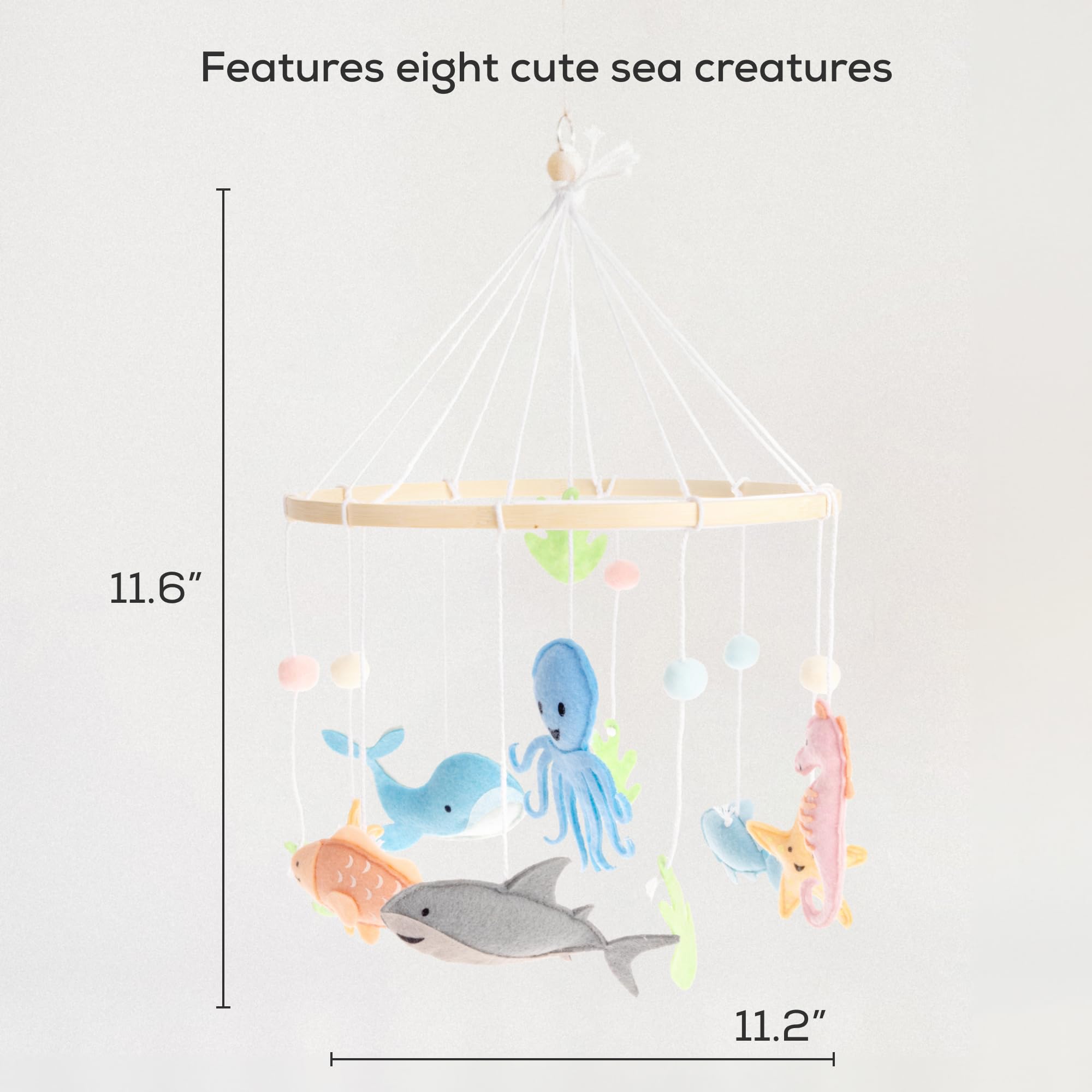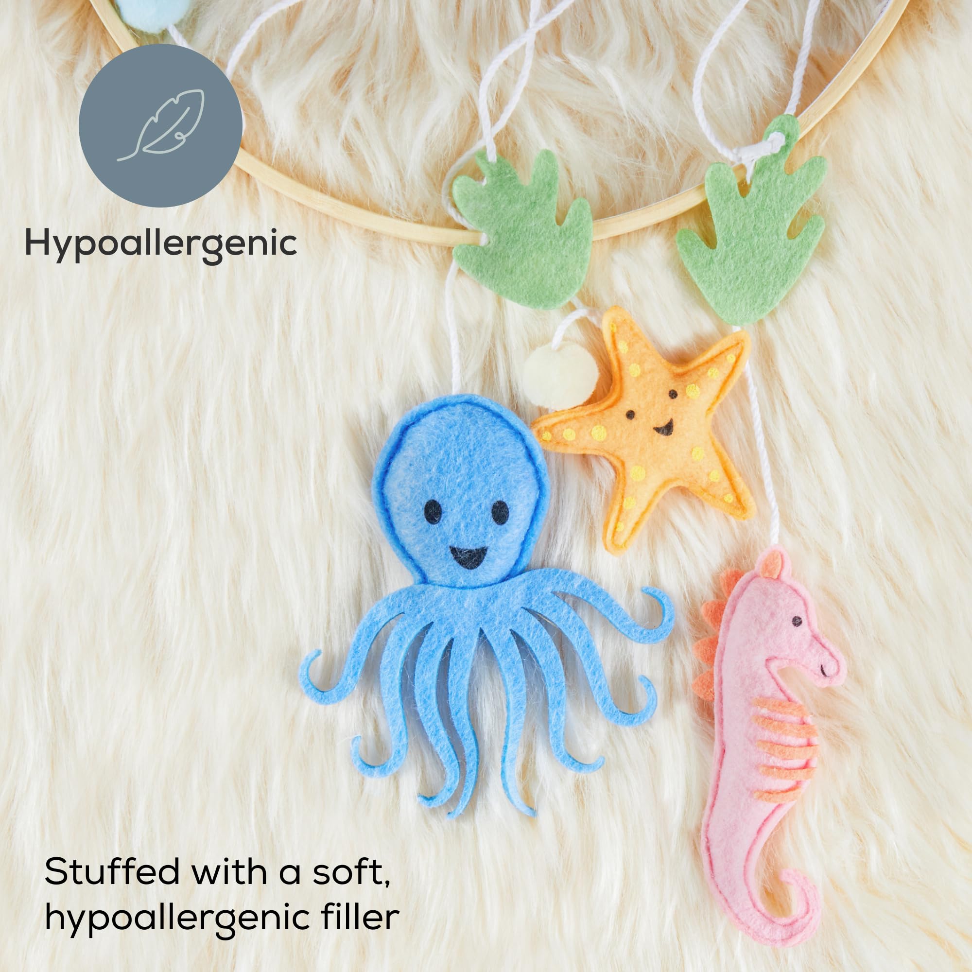 100% Environmentally-Friendly Material - Our baby crib mobile is hand-sewn from the highest quality eco-friendly felt, stuffed with a soft hypoallergenic filler. The soft, plush animal designs are intricately detailed with careful stitching and are meant to complement any ocean animals nursery