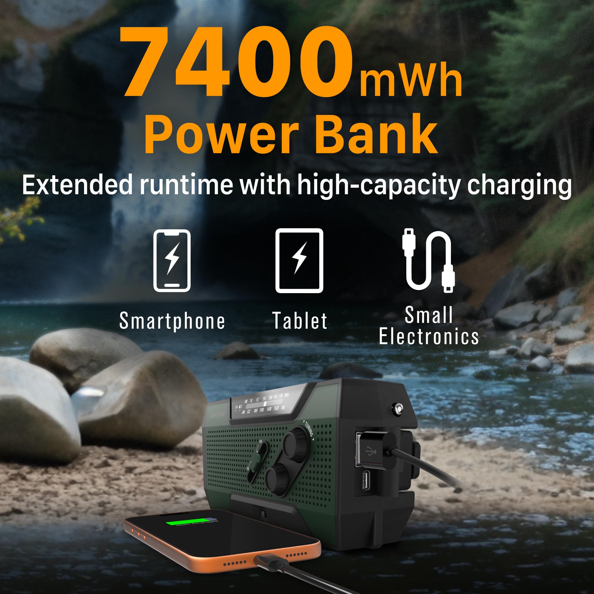 [7400mWh (2000mAh) Power Bank Will Keep Devices Powered] The FosPower FOSPWB-2376 (A1) emergency radio incorporates a 7400mWh (2000mAh) power bank capable of providing emergency power to any small tablet or phone.