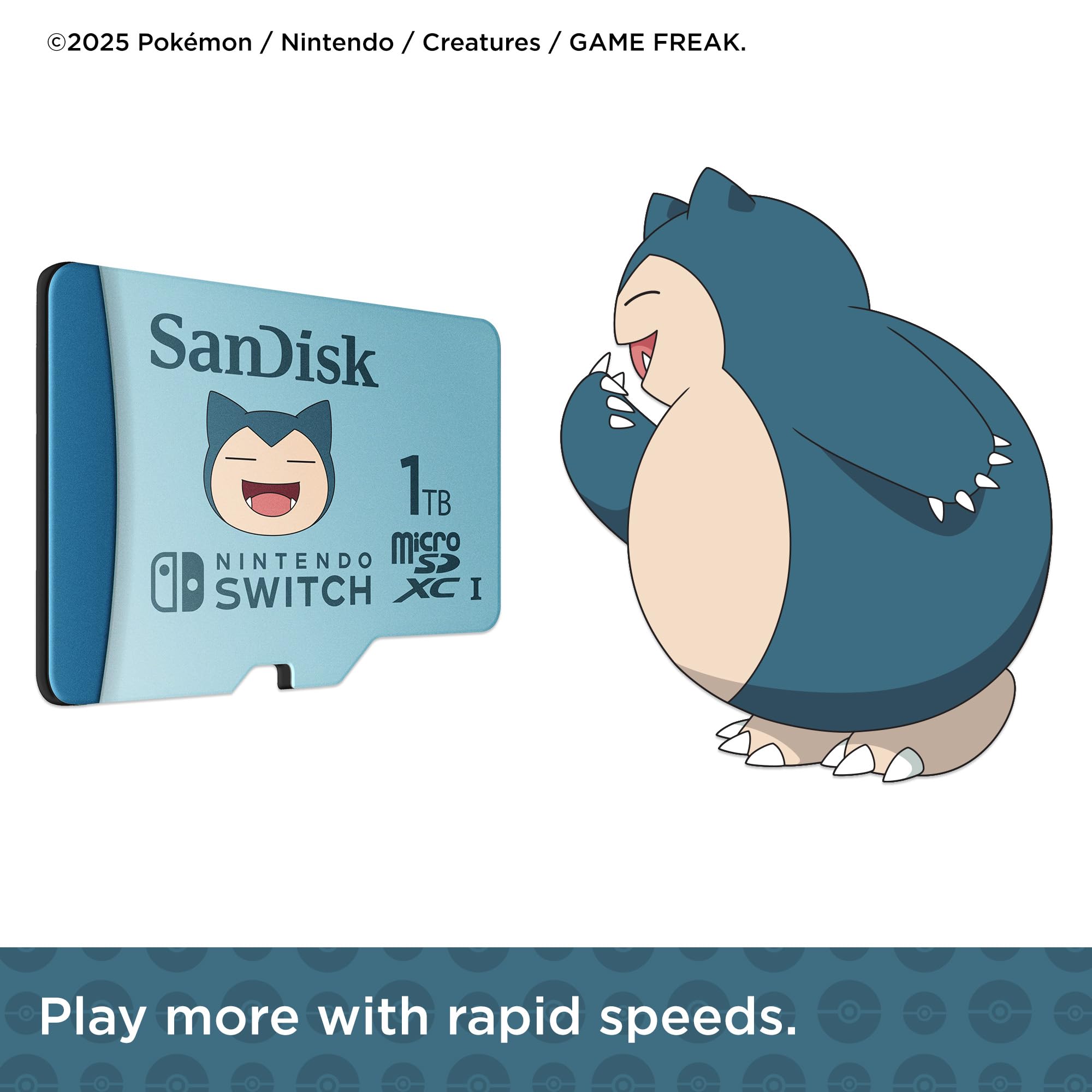Play your games in Pokémon style with this officially licensed microSD card line for Nintendo Switch from SanDisk. Fan favorites like Snorlax add some Pokémon flair to your storage, and each specially designed card is tested and approved for use with Nintendo Switch systems. Begin your Pokémon adventures faster with read speeds up to 100MB/s, and add your favorite titles, videos, screenshots, and more to your card at rapid write speeds up to 90MB/s. (Based on internal testing; performance may be lower depending upon host device, interface, usage conditions and other factors. 1MB = 1,000,000 bytes.)