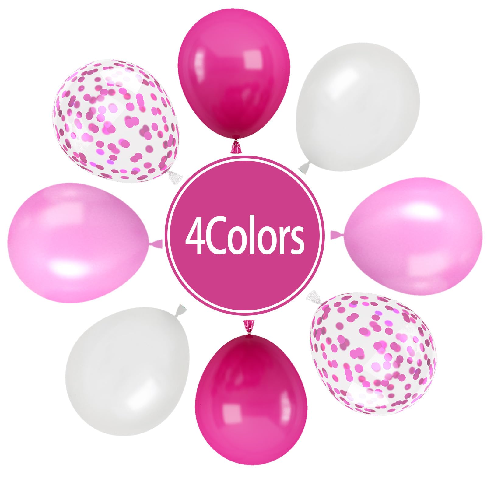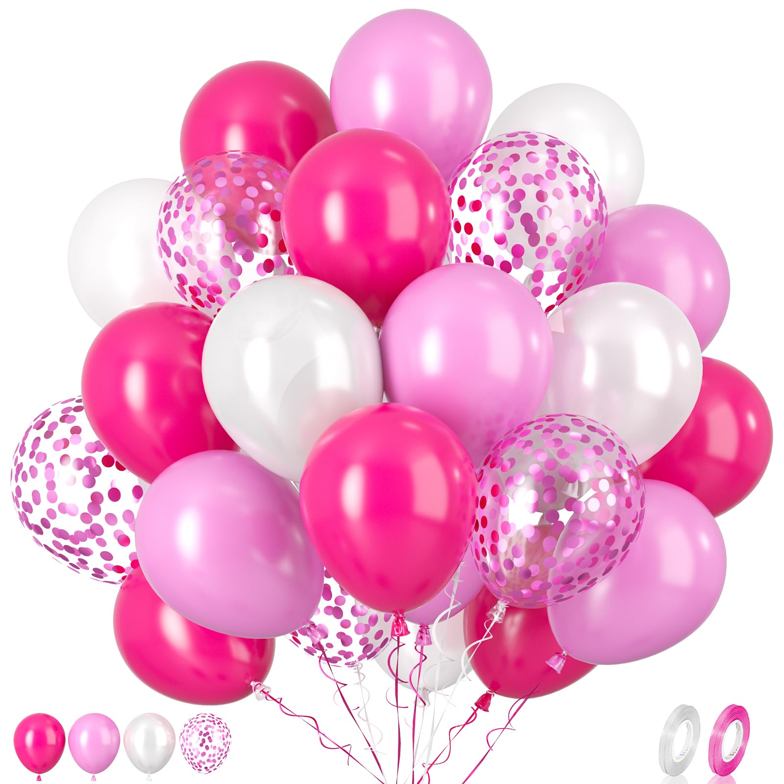 Hot Pink Balloons Set: The 12 inch 62pcs hot pink balloons set includes 20pcs hot pink balloons, 15pcs pink balloons, 10pcs pink confetti balloons, 15pcs pearl white balloons, 2 roll of ribbon. A variety of hot pink latex balloons is suitable for your beautiful art theme decoration.