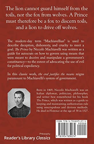 The lion cannot guard himself from the toils, nor the fox from wolves. A Prince must therefore be a fox to discern toils, and a lion to drive off wolves. The modern-day term “Machiavellian” is used to describe deception, dishonesty, and cruelty to meet a goal. The Prince by Niccolò Machiavelli was written as a guide for autocrats on how to govern using means that were meant to deceive and manipulate a government’s constituency—to the extent of advocating the use of evil for political expediency. In this classic work, the end justifies the means reigns paramount to Machiavelli’s system of government.