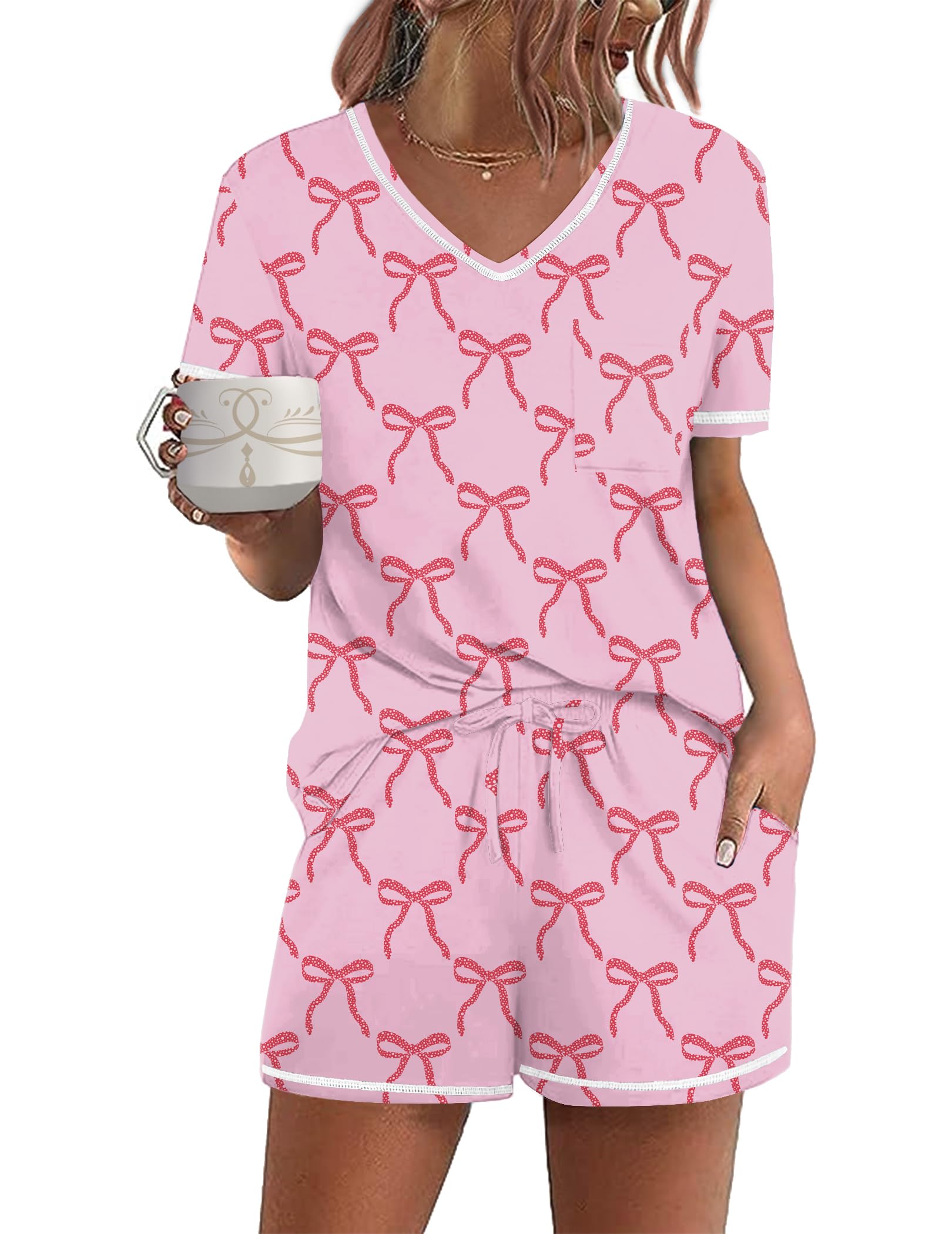 Design: The pajama top features classic chest pocket and V neck, with exquisite hemming workmanship; the pajama shorts features adjustable drawstring and pockets. Loose fit lounge sets, cute and comfy pajamas for women and teens girls