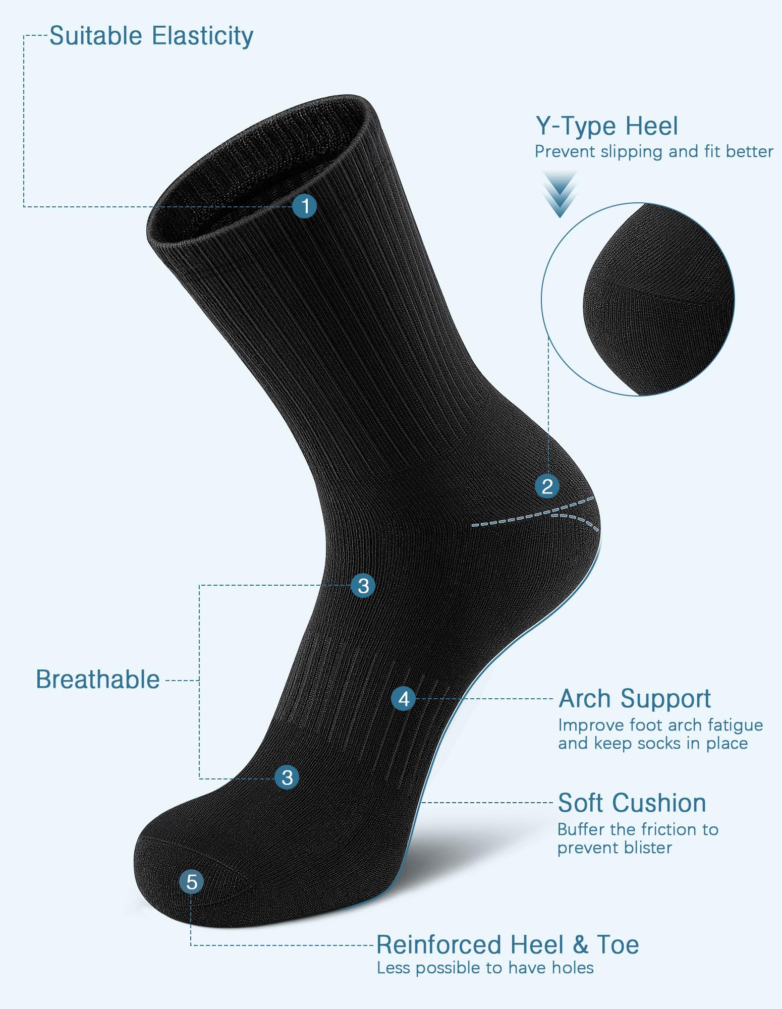 [FULL CUSHIONED SPORT SOCKS]: Crew socks provide better support, constructed with soft plush sole cushioning for extra durability and softness in high-wear areas, reduce the impact on the knee. Elastic arch support and mesh top design are provided with proper compression force, meanwhile, can also keep in good air permeability. Comfortable seamless toe ensures protection against yarn chafing and irritation caused by traditional toe seams.