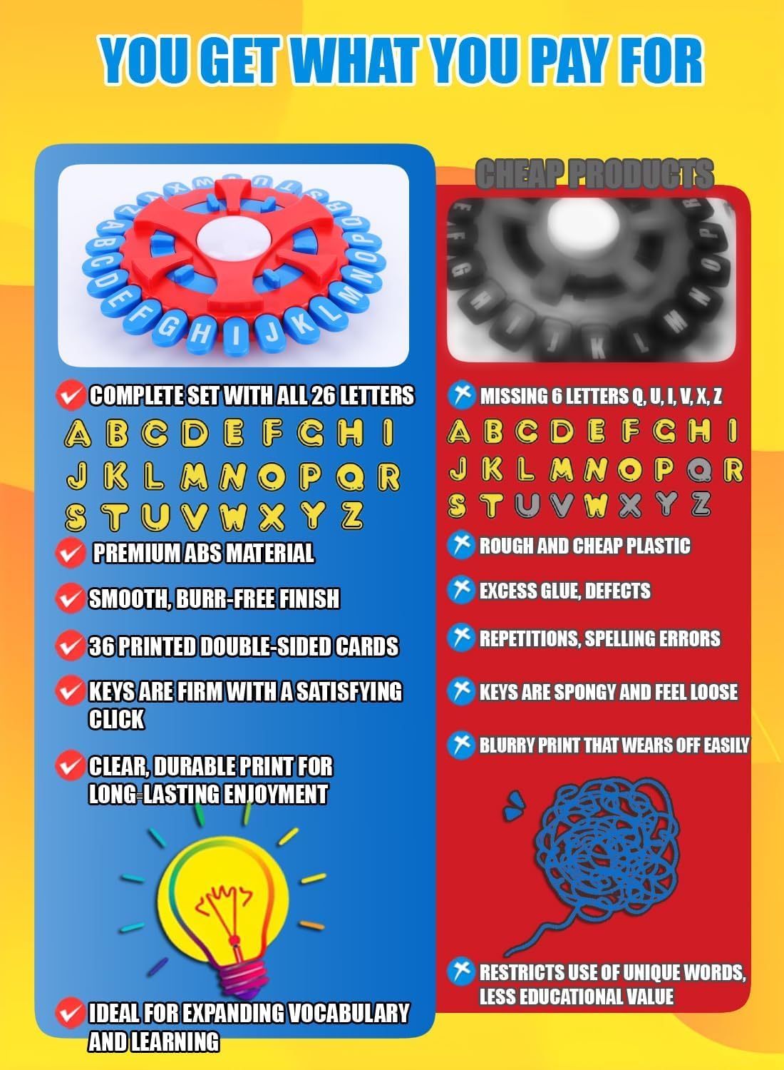 🌟【Full Alphabet Keys】No missing letters! Challenge your creativity with a complete 26-Letter game board, This fast-paced game is here to test your quick thinking and vocabulary prowess! perfect for word lovers and language enthusiasts.Batteries Required: 2 AA (not included)