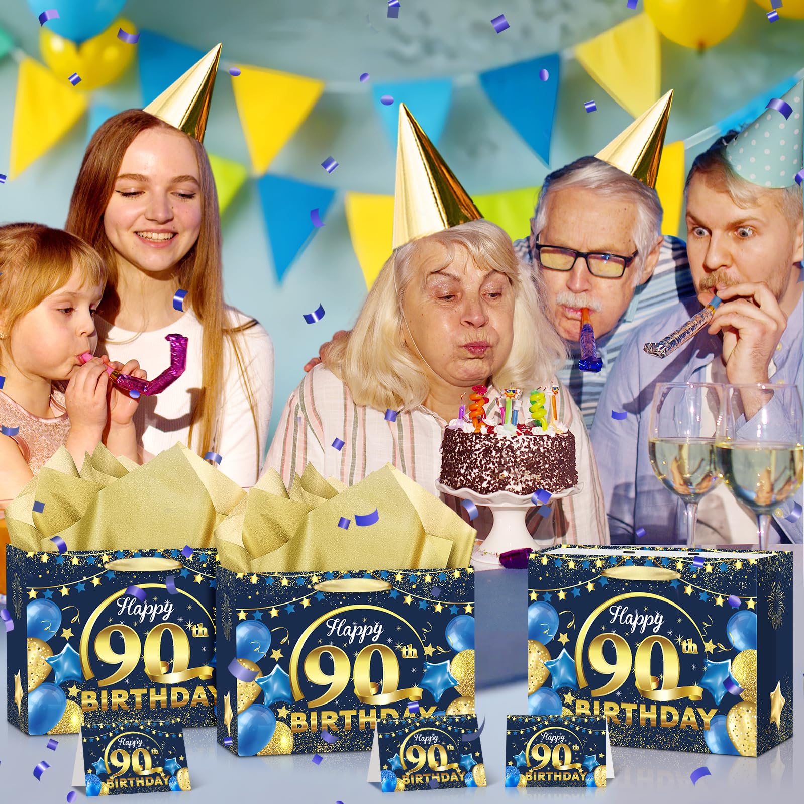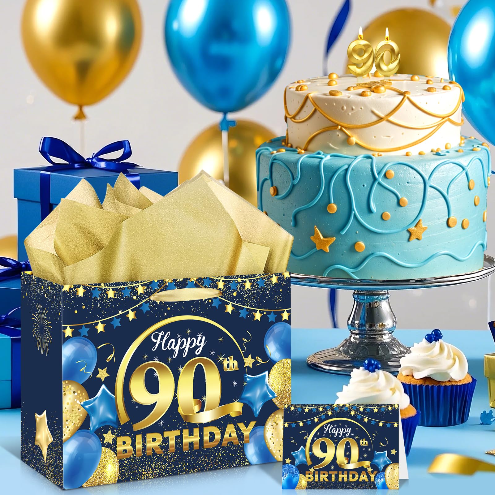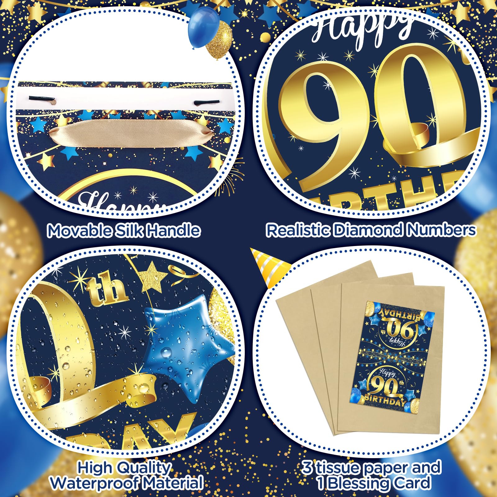 Great Design:Navy Blue and Gold 90th birthday gift bag features a very shiny and realistic print, with a 90th birthday blessing card and 3pcs gold tissue paper which make the birthday gifts look more full of birthday party atmosphere