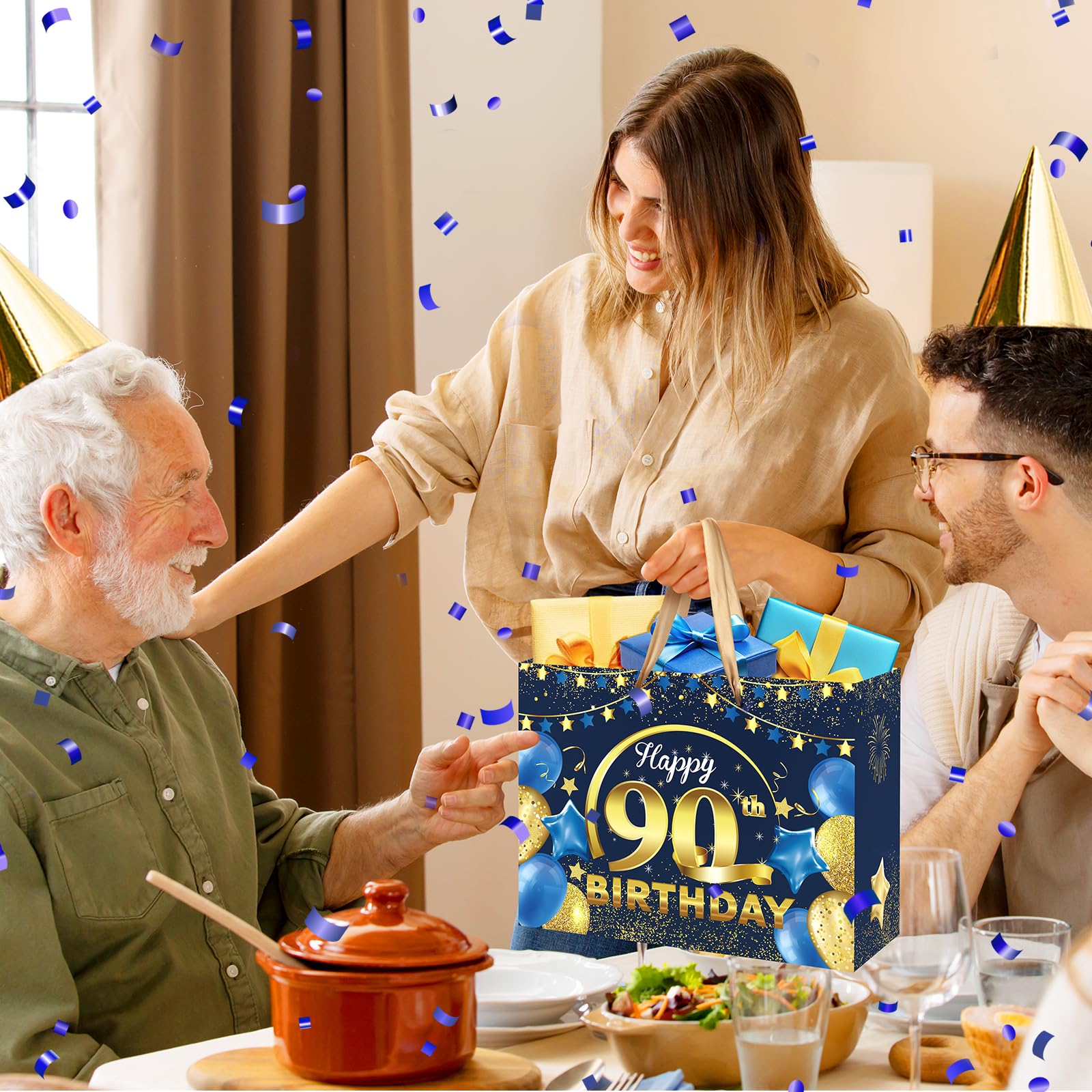 Size:The size of Navy Blue and Gold 90th birthday gift bag:30 x 24 x 13.5 cm/11.8 x 9.4 x 5.3 inches; The size of 90th birthday blessing card: 18 x 12 cm/7.1 x 4.7 inches, The 90th birthday gift bag is large enough to hold a large number of gifts