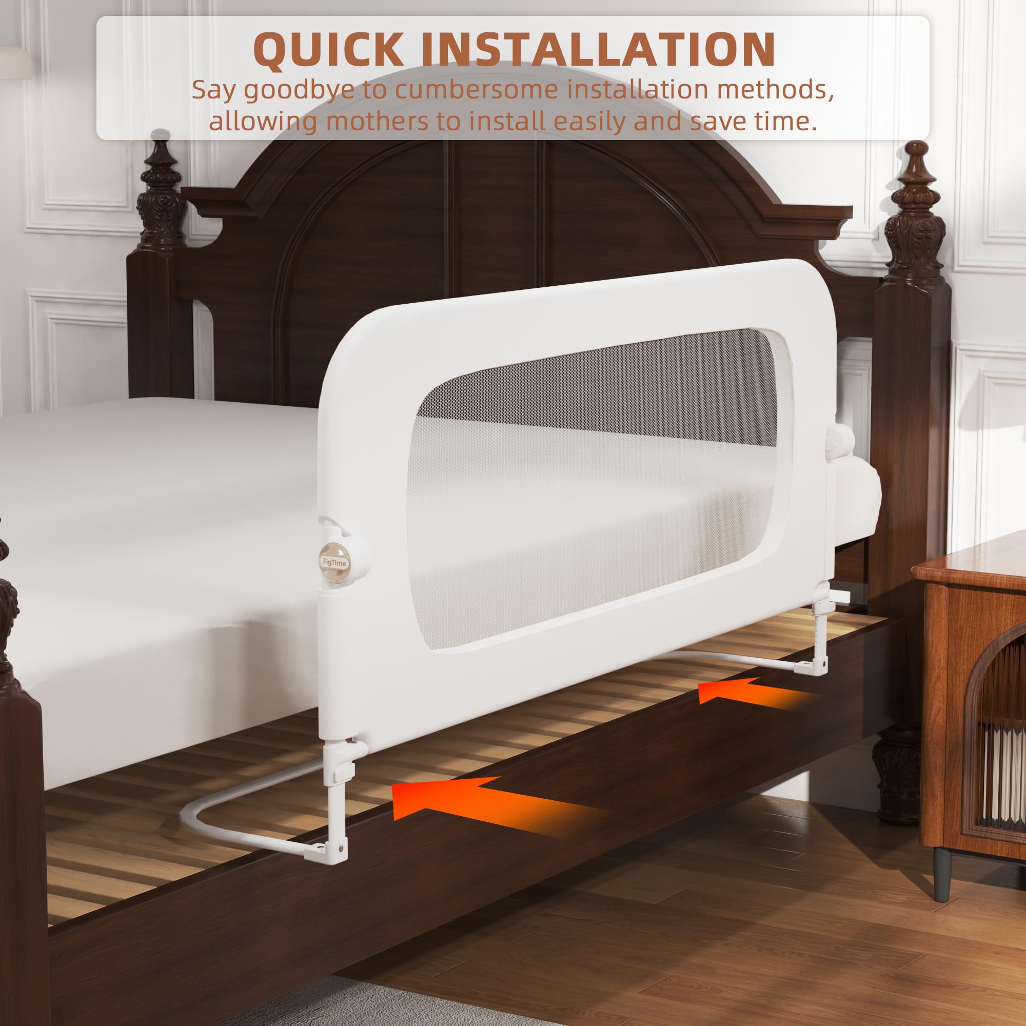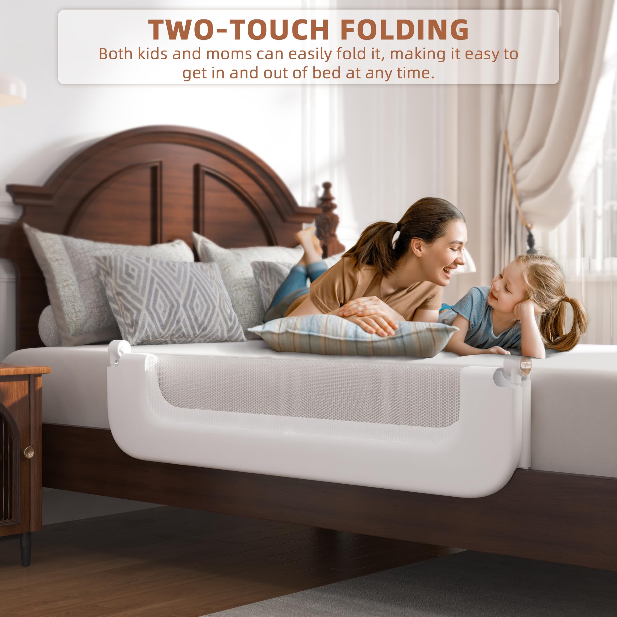 【TWO-TOUCH FOLDING】FigTime toddler bed rails are designed to fold easily, making it easier to get in and out of bed and easier for mothers to take care of their children. Both mothers and children can fold them easily, which simplifies daily work and enhances the overall user experience. The bed rail guard can be quickly installed in the bed, which saves time and effort for all parents. This design makes it an ideal choice for mothers who value convenience.