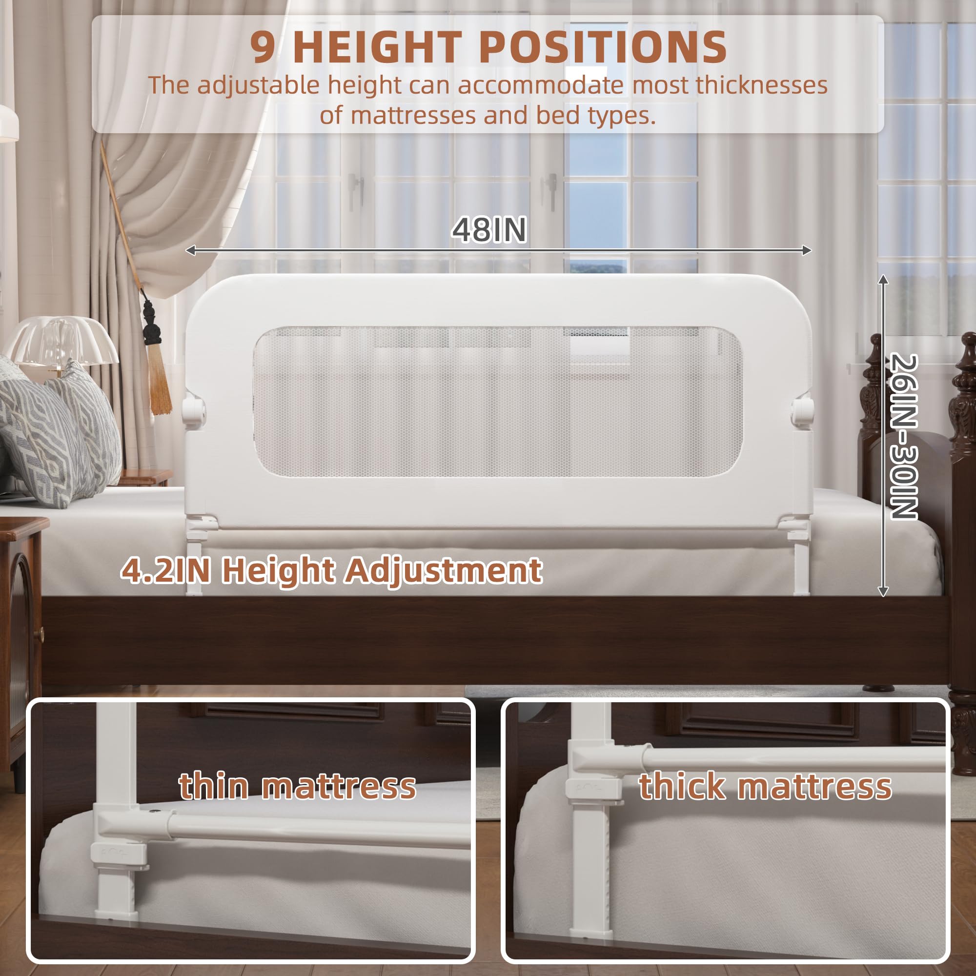 【ADJUSTABLE HEIGHT】FigTime toddler bed rails are equipped with 9 levels of adjustable height, which can flexibly adapt to various mattress heights, ensuring that the bed rails fit tightly with the mattress to achieve no gaps! As the child grows and the mattress height changes, the 26 to 32IN bed rail height can ensure comfort and safety, creating a perfect sleeping environment for your child. Suitable for most bed types on the market, such as box beds, wooden boards, flat beds, rib beds, etc.