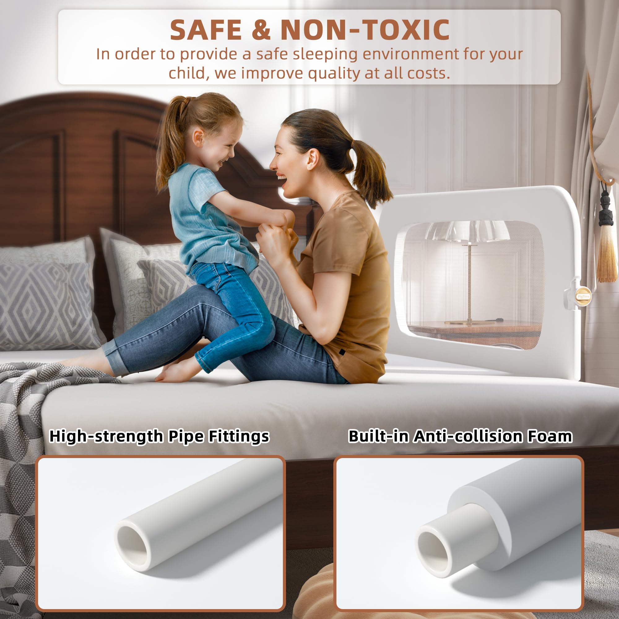 【SUPER STABILITY】Our baby bed rail guard base uses a U-shaped design to maximize the force-bearing area. No matter how your child moves and plays, it can ensure that the bed rail is fixed in place night after night. We have strengthened the thickness of the pipes to improve the overall stability and lifespan to ensure that it can withstand the rigors of daily use. Choose FigTime and enjoy peace of mind. Because you know your child is safe.