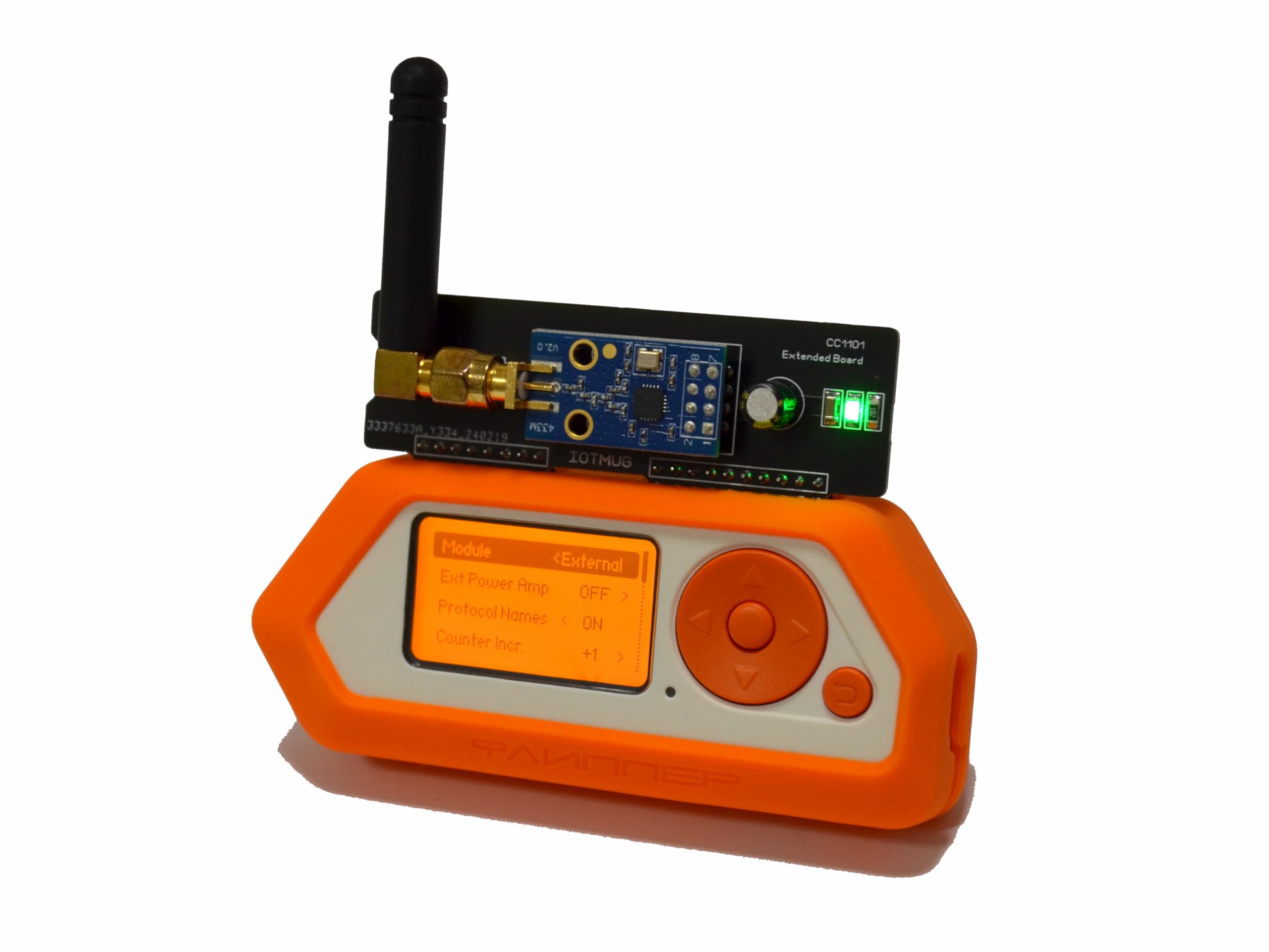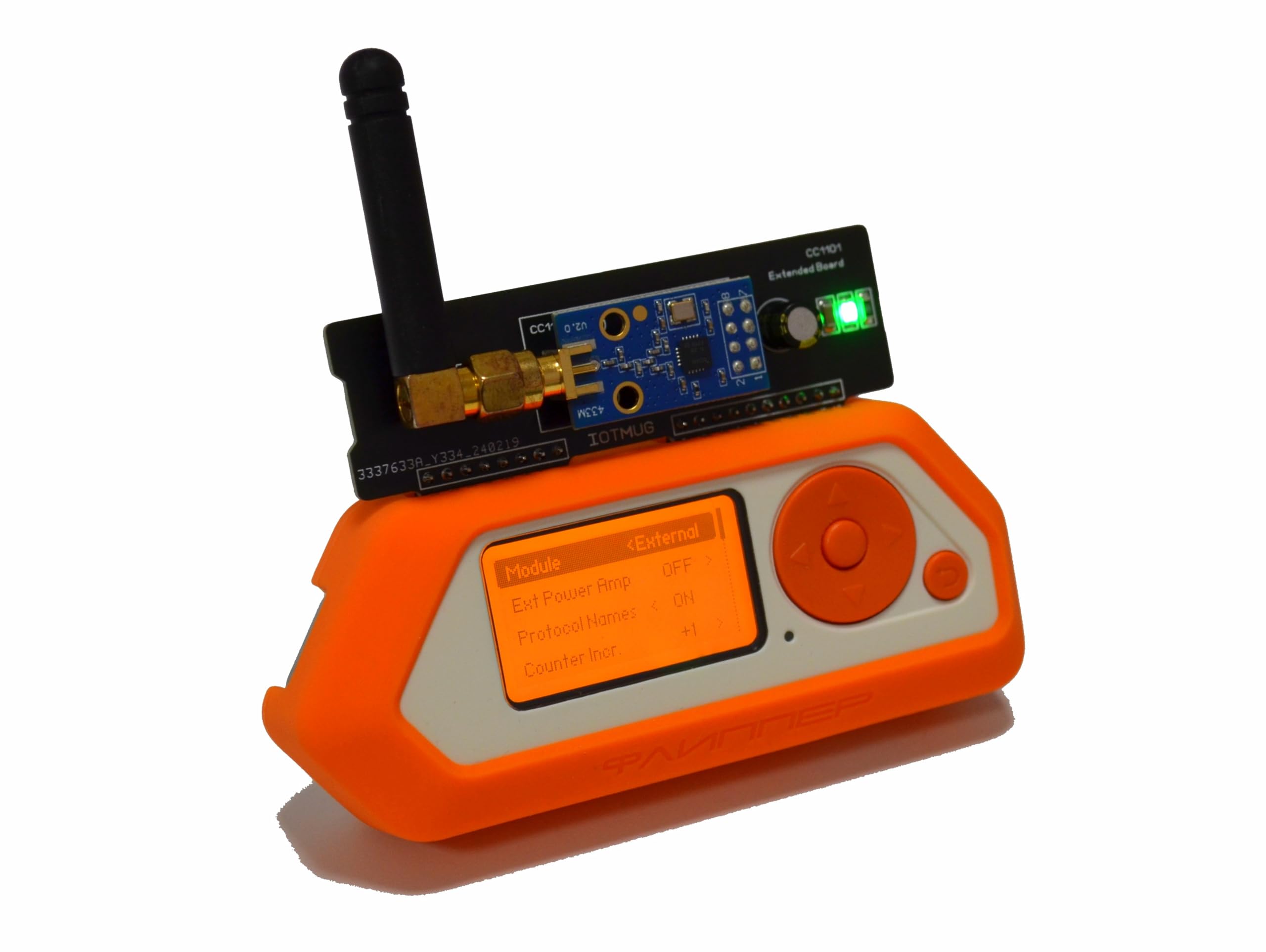Flipper Zero external CC1101 module. A fully assembled external CC1101 module board for the Flipper Zero device. The CC1101 external module allows you to significantly increase the Sub-GHz range of your Flipper Zero. Increases from 5-10 meters (built-in default antenna) to 70-150 meters depending on the terrain. External high-gain antenna is included. Drastically extends the range of the Sub-Ghz capabilities of the Flipper Zero. Tested transmission up to 500 feet on the open area. Tested recording up to 10 feet with line of sight. The board can be used with any recent version of Unleashed, Roguemaster, or Xtreme firmware for the Flipper Zero. To enable the use of the external CC1101 go to the SubGhz menu and select Radi Settings, than toggle the setting from 'Internal' to 'External' and the Flipper will now use the external cc1101 board for SubGhz functions.