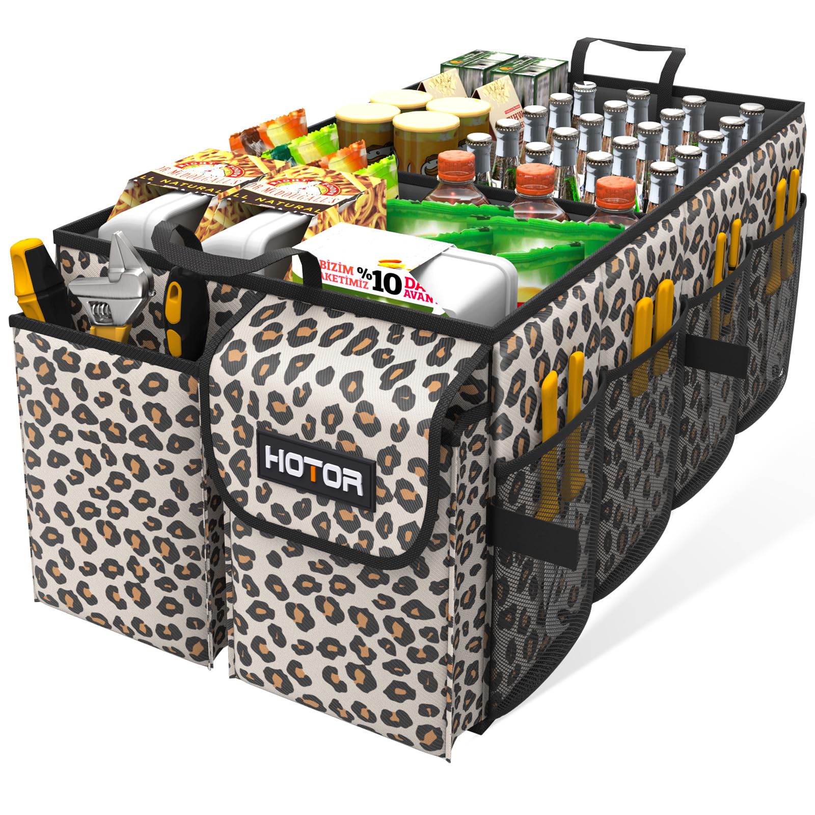 CONVENIENT ACCESS: HOTOR car trunk organizer for SUV is equipped with 2 compartments and 6 stretchy mesh pockets to make items easy to see and grab when needed. No more digging around a messy trunk to find what you need. Just grab and go.