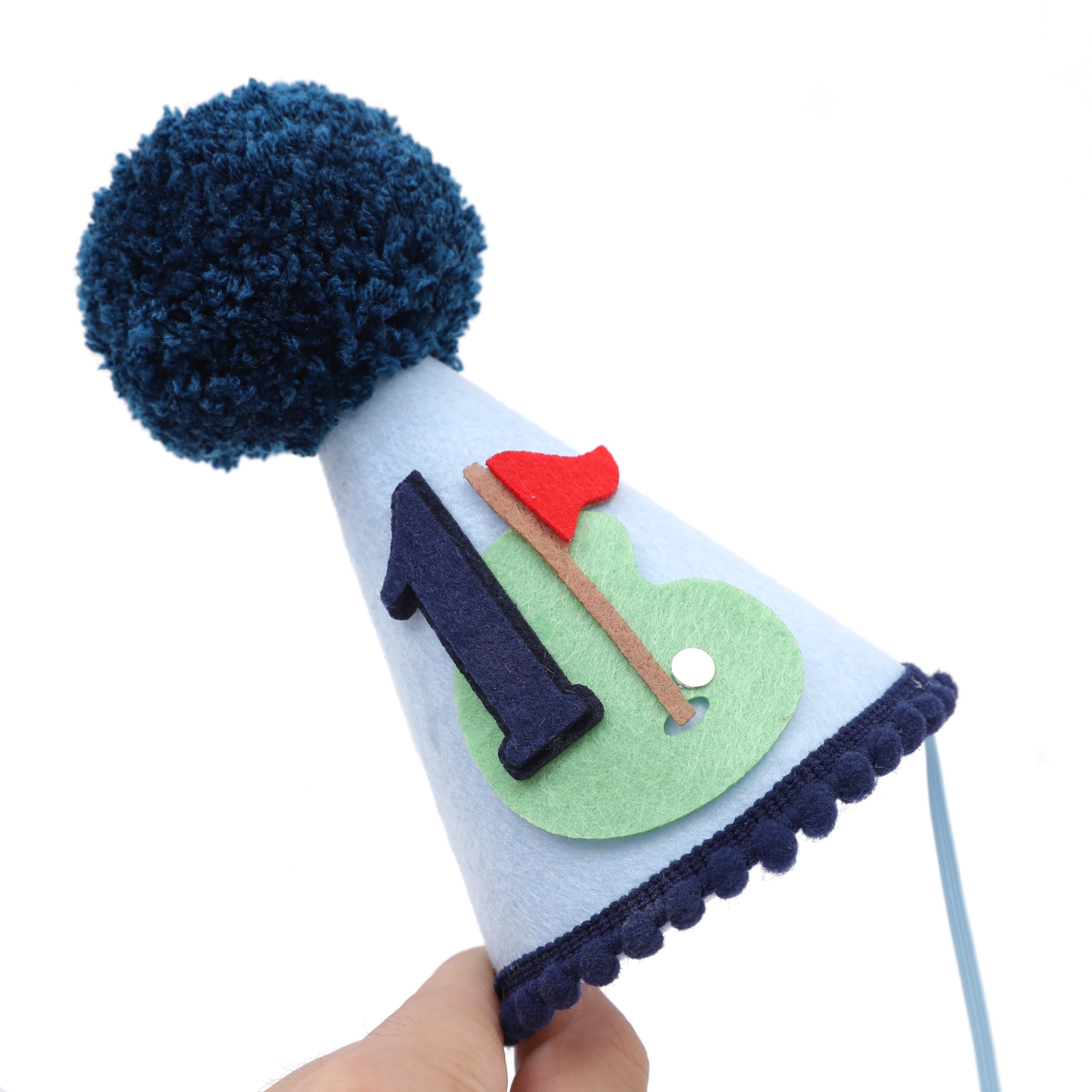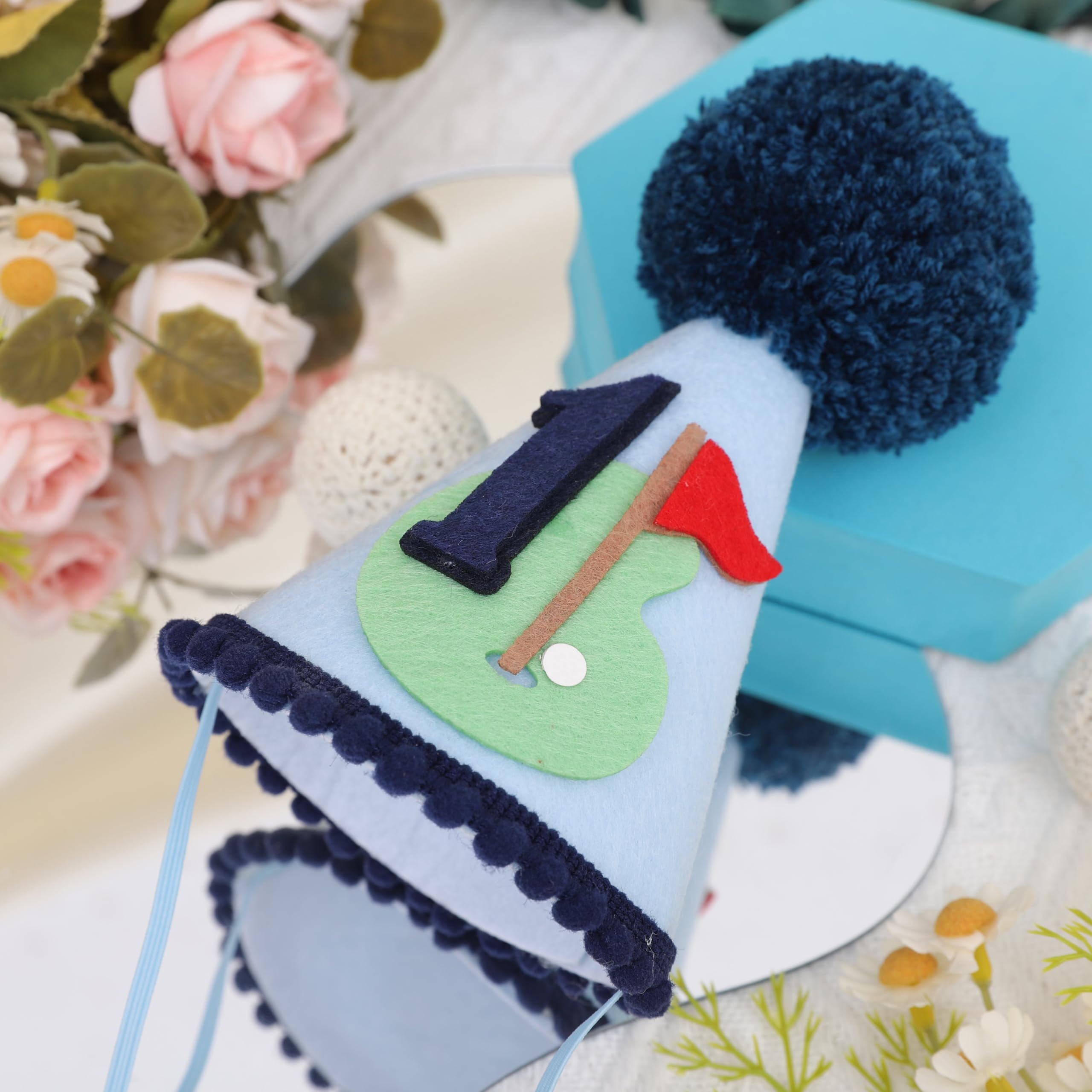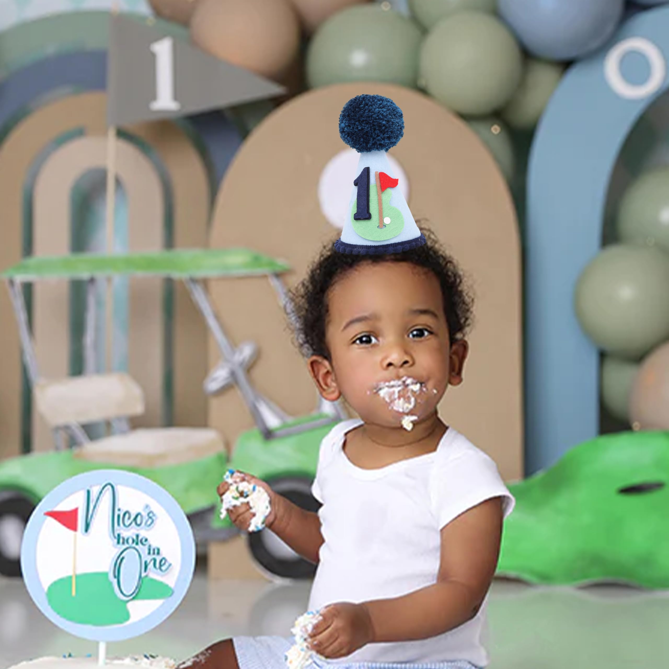 Adorable Golf-Themed Design: Celebrate your little one's "Hole in One" milestone with this charming golf-inspired 1st birthday hat, featuring vibrant felt decorations like a golf green, flag, and bold "1" for a sporty, playful look.
