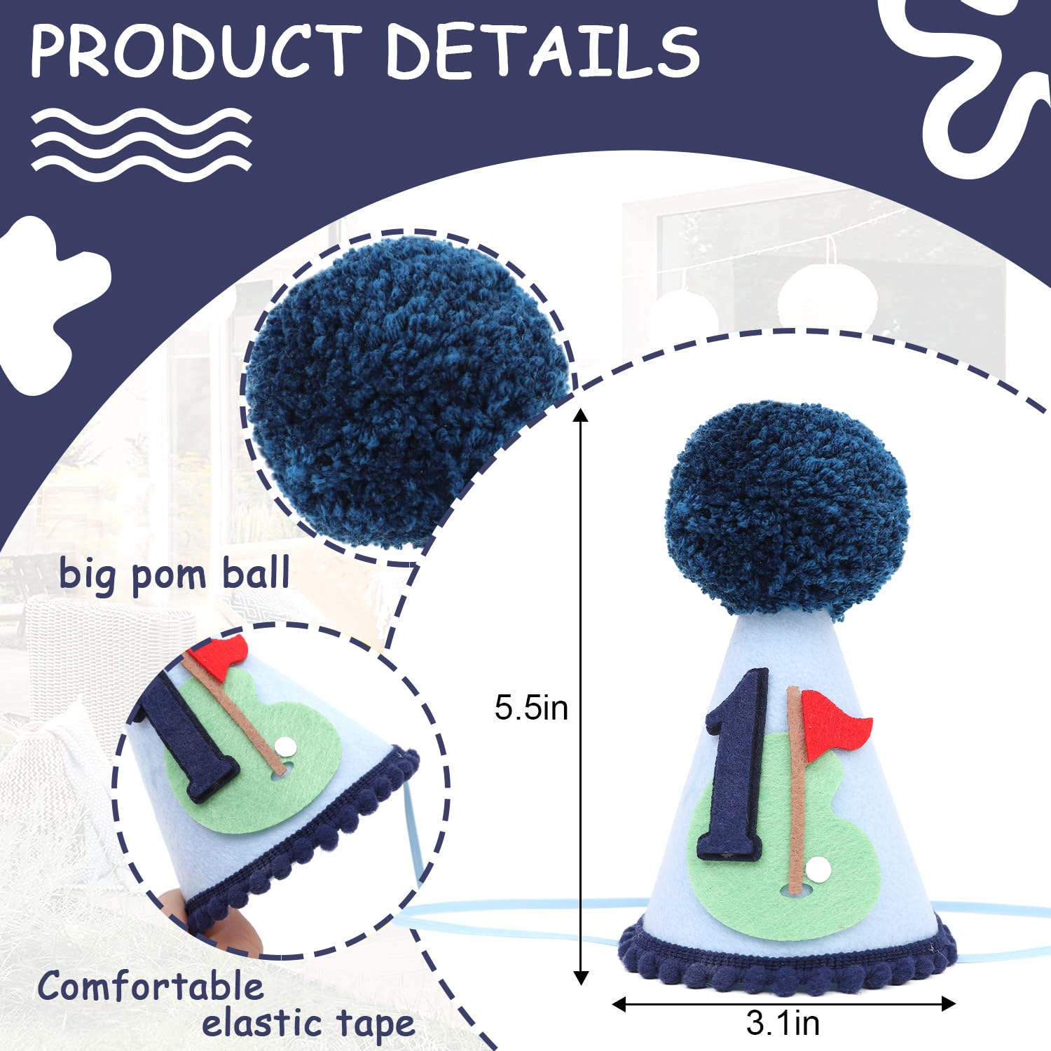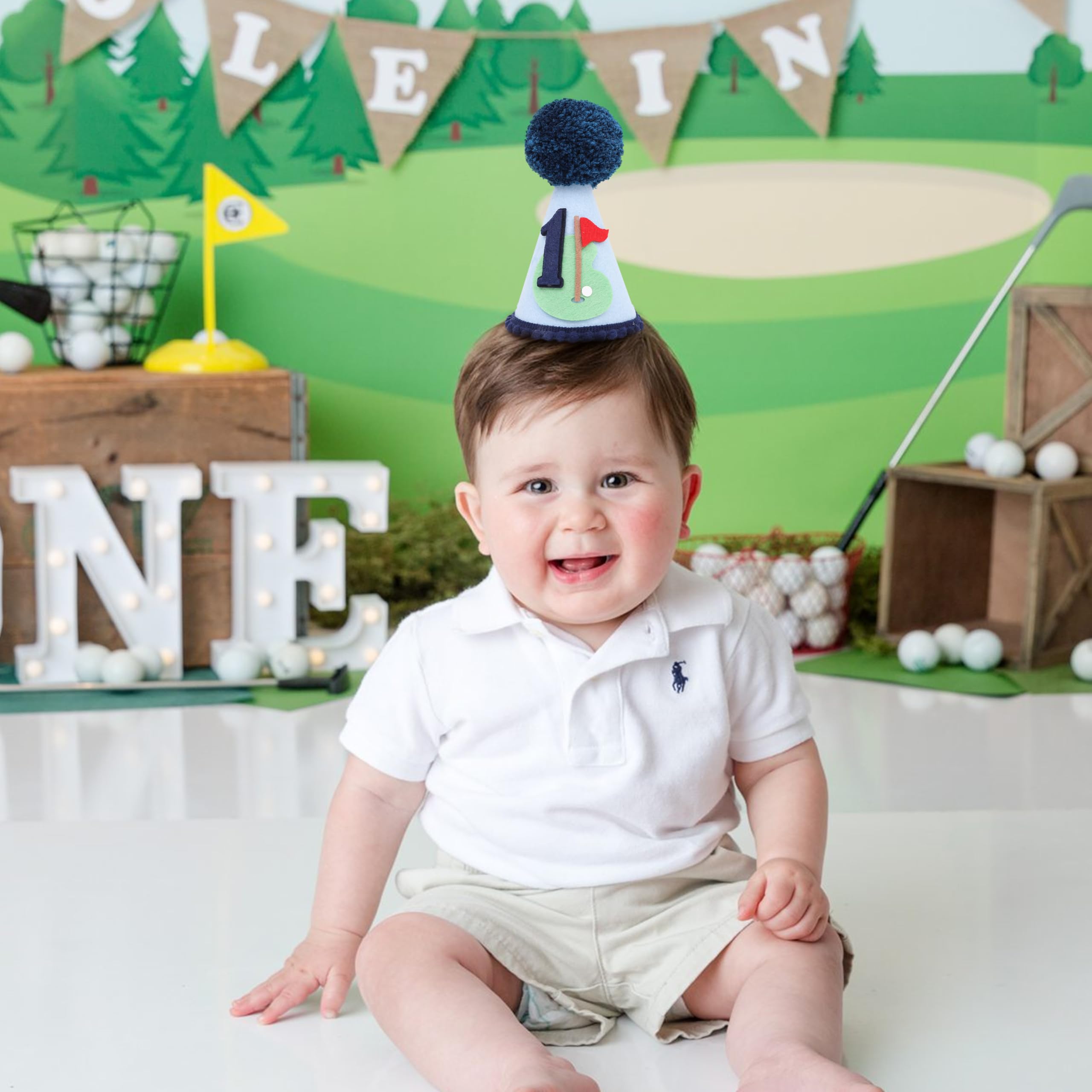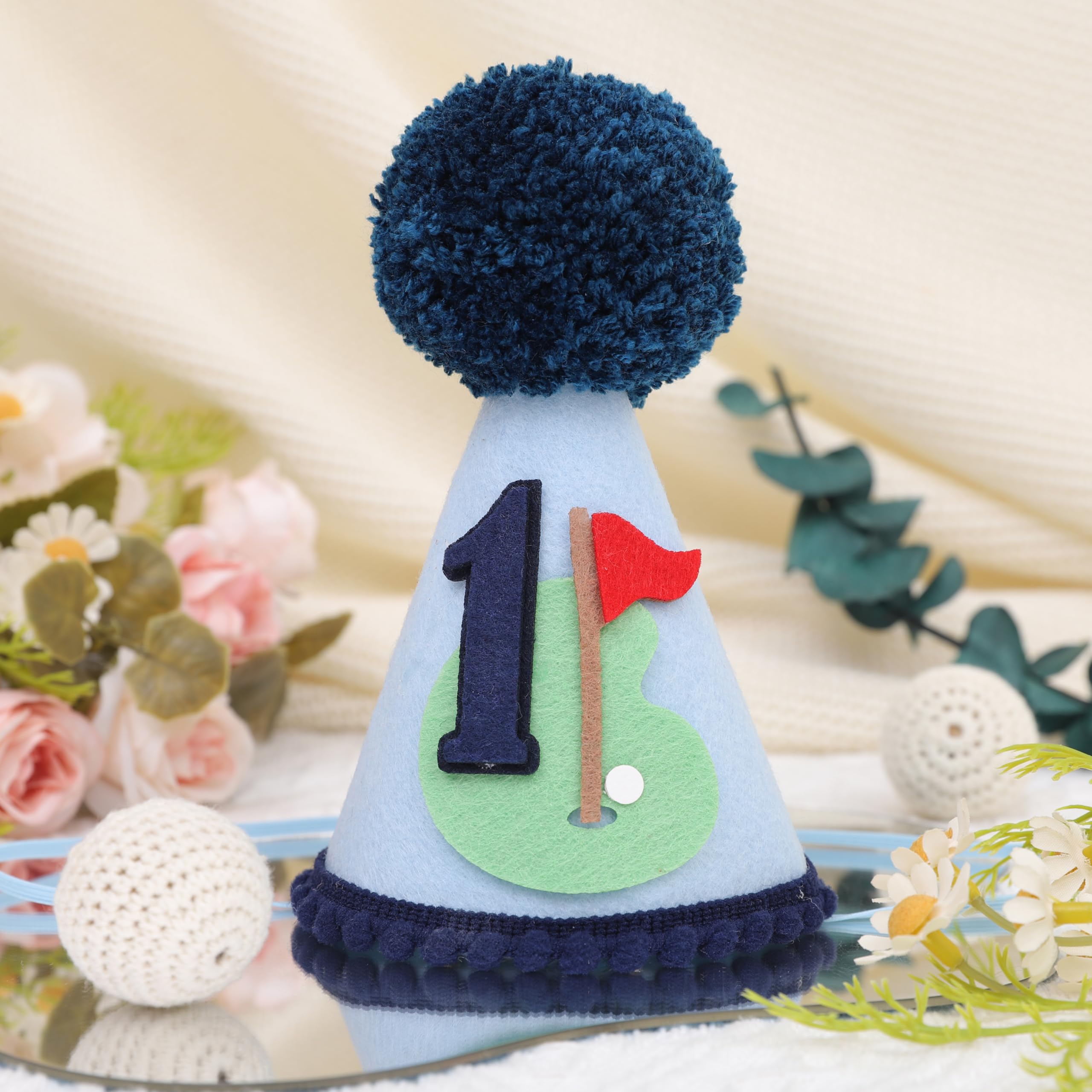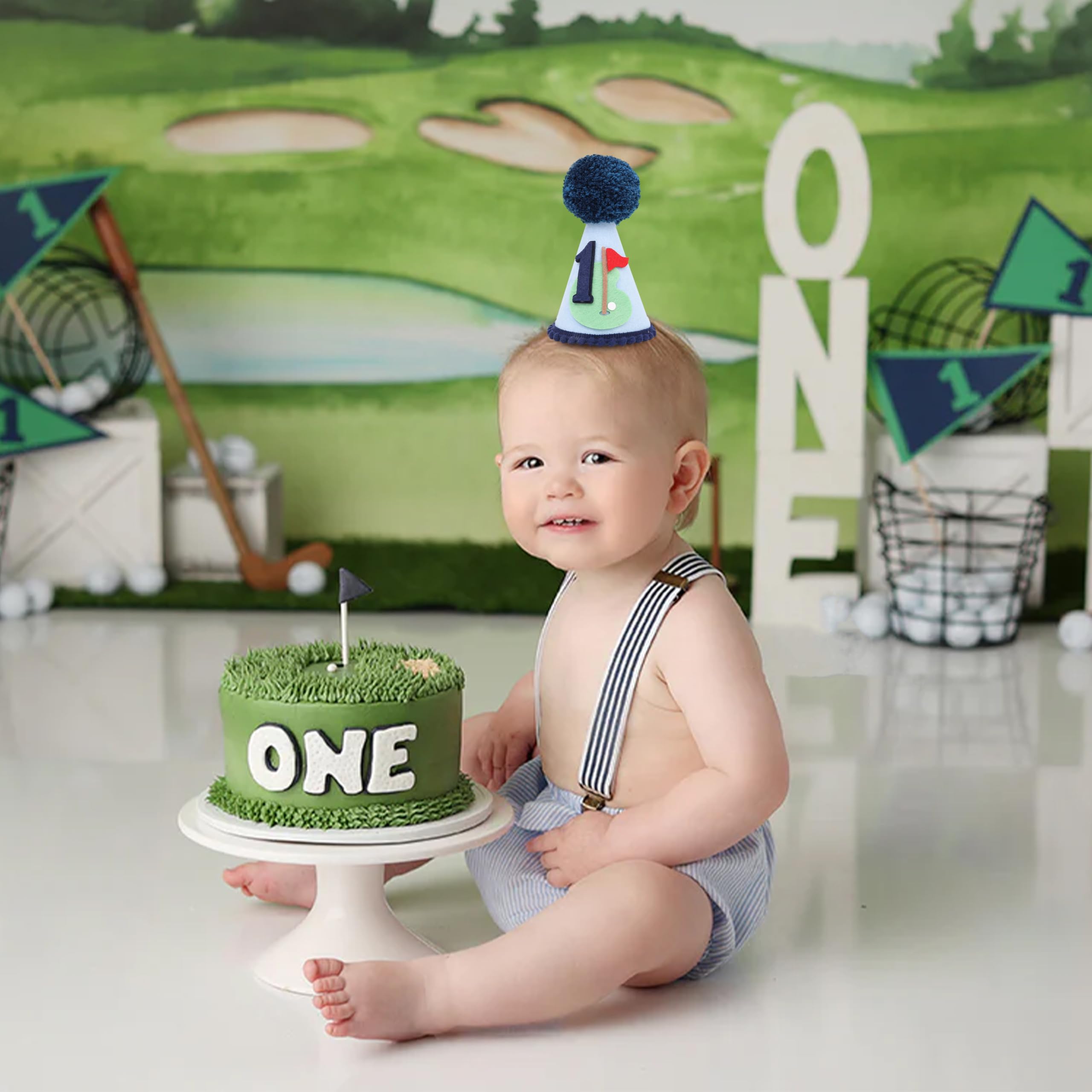 Adorable Golf-Themed Design: Celebrate your little one's "Hole in One" milestone with this charming golf-inspired 1st birthday hat, featuring vibrant felt decorations like a golf green, flag, and bold "1" for a sporty, playful look.