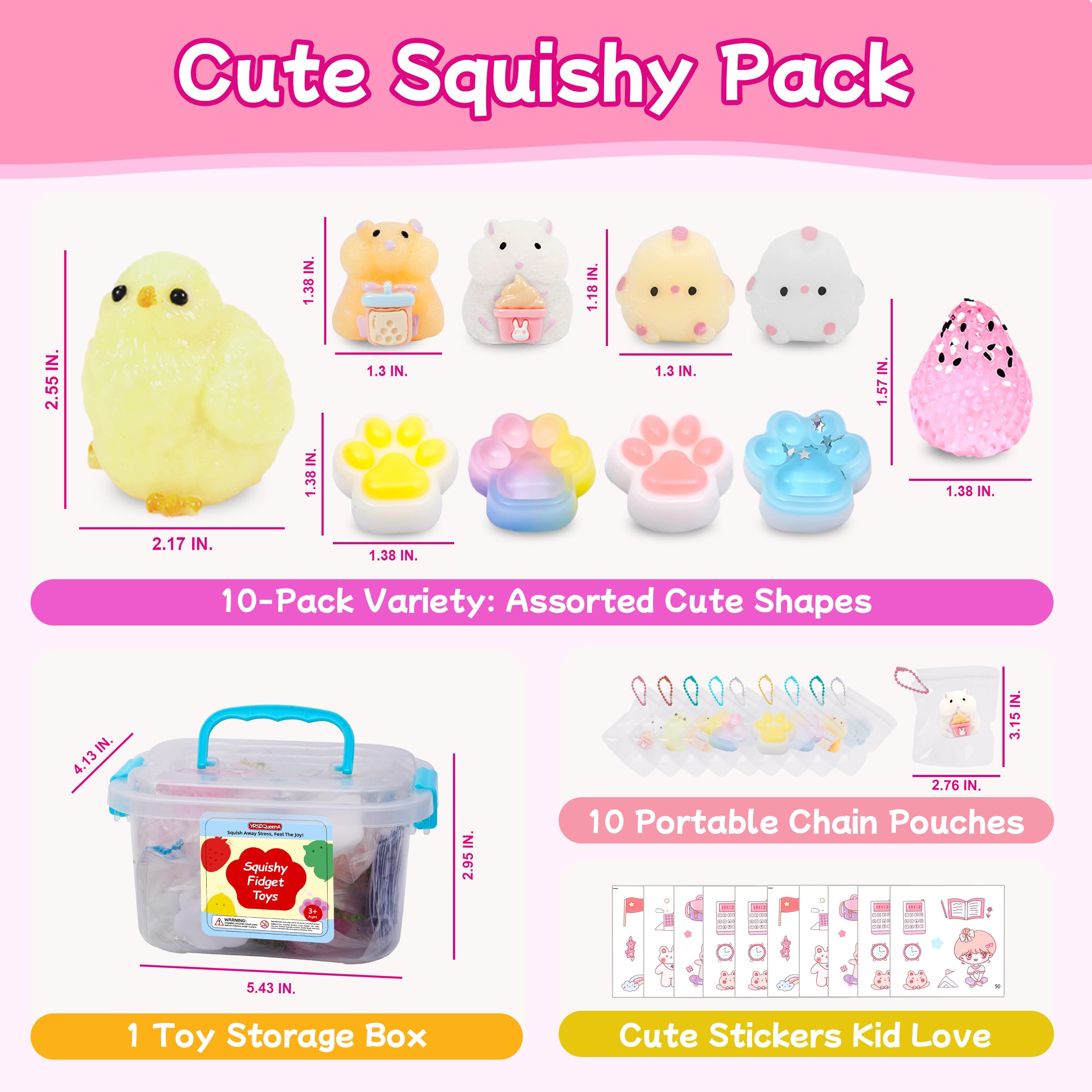 【Exquisite Squishy Pack 】This Squishy toys set includes 10pack kawaii taba squishies (3 Squishy Chick +4 Squishy Paw+1 Squishy Strawberry+2 squishy hamster) with 10 sets stickers , almost covering the most popular cute toys on the market.Each squishy fidget toy has its own Portable Chain Pouches. Includes a reusable storage box. Best treasure box toys for classroom or Perfect gift set. This Squishy Pack makes the ideal gift boys and gils will love!