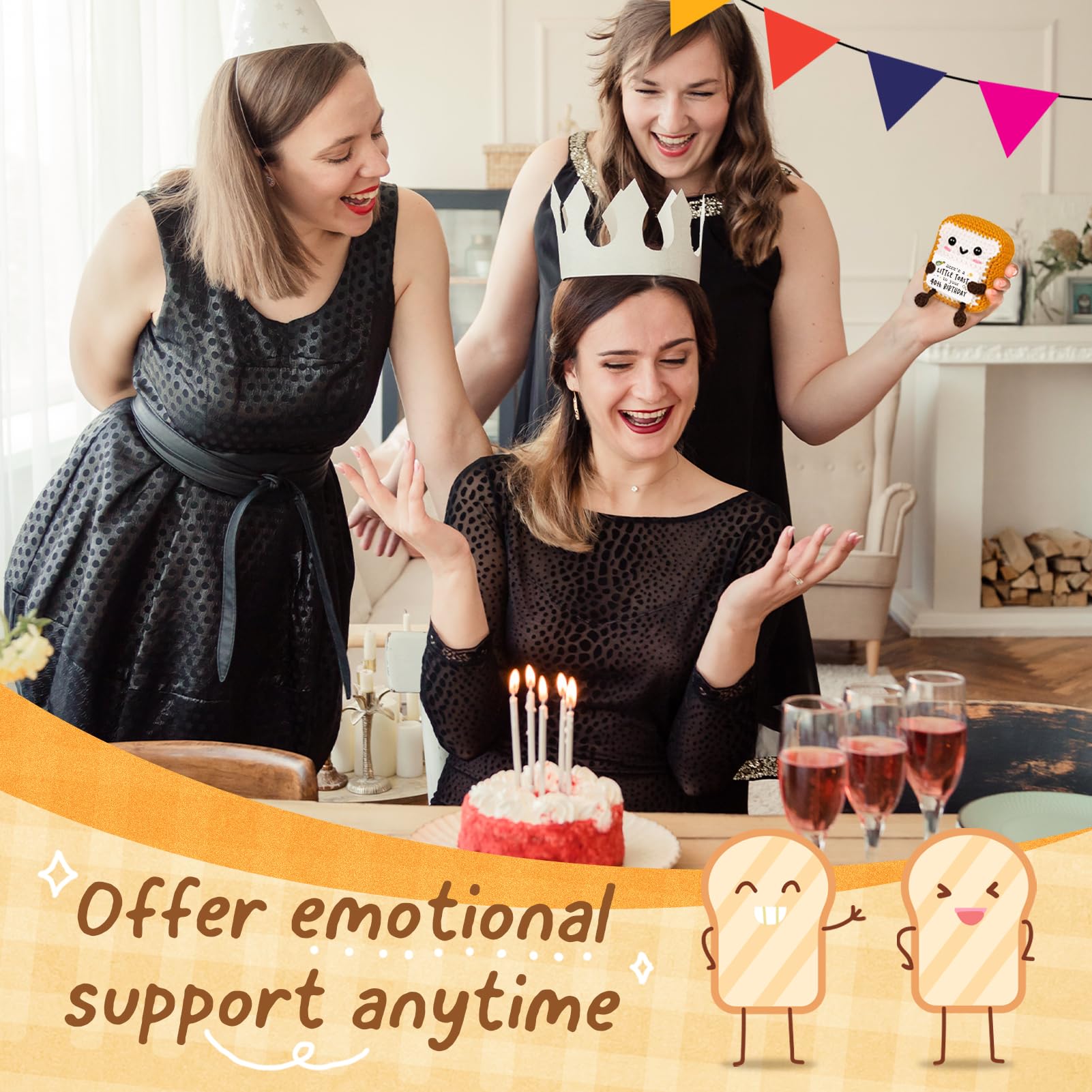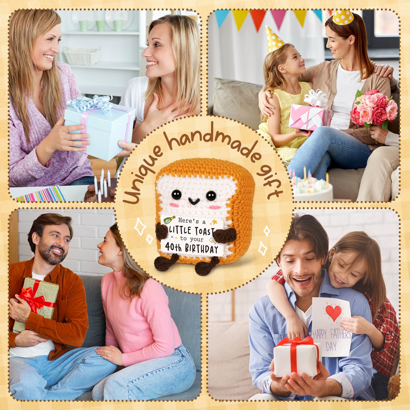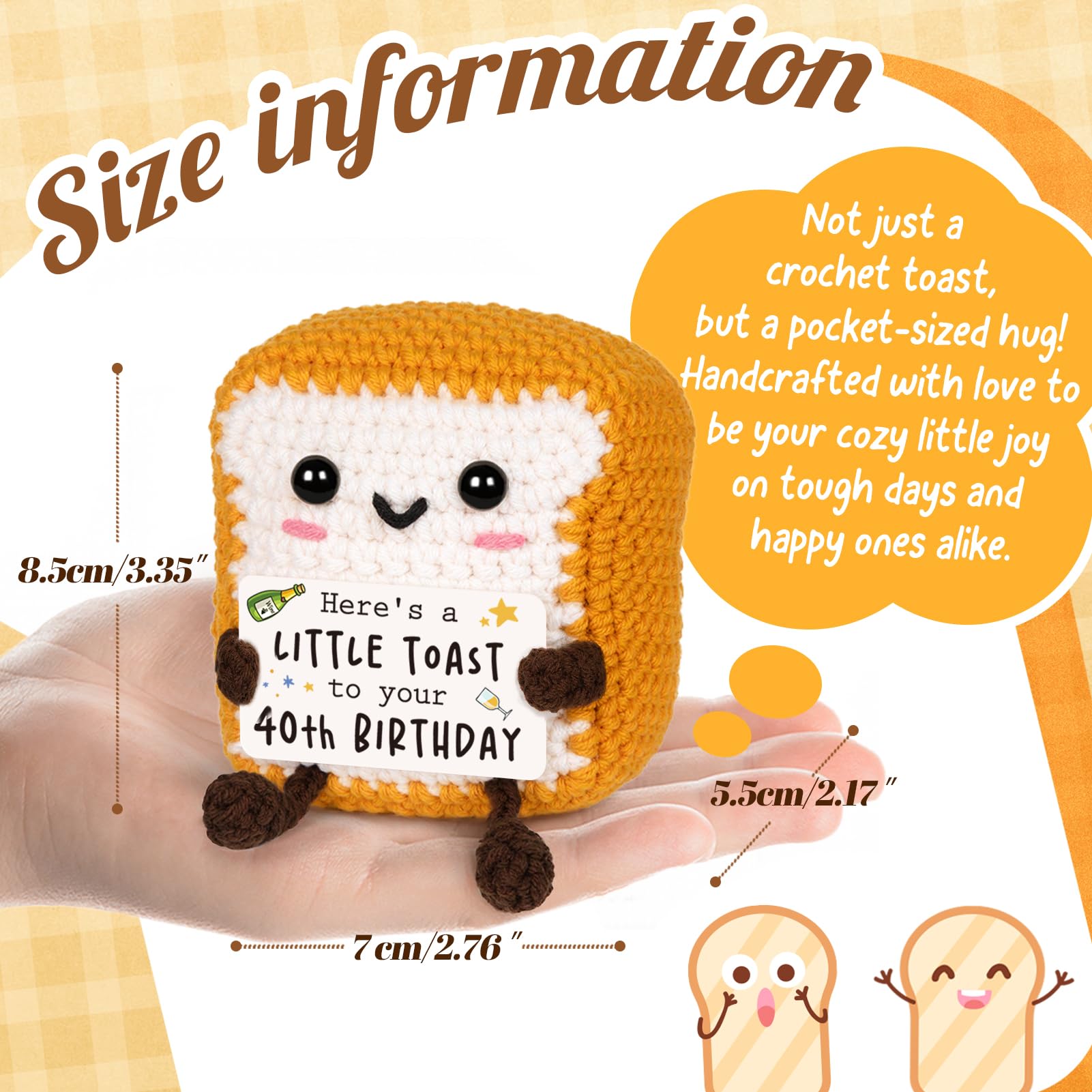 Handmade Toast Details: Handmade with high-quality cotton yarn, it’s soft to the touch, springy, and resistant to deformation. Paying attention to detail, this product can sit or stand on its own without any support. All features make this handmade crochet toast the perfect gift for a 40th birthday!