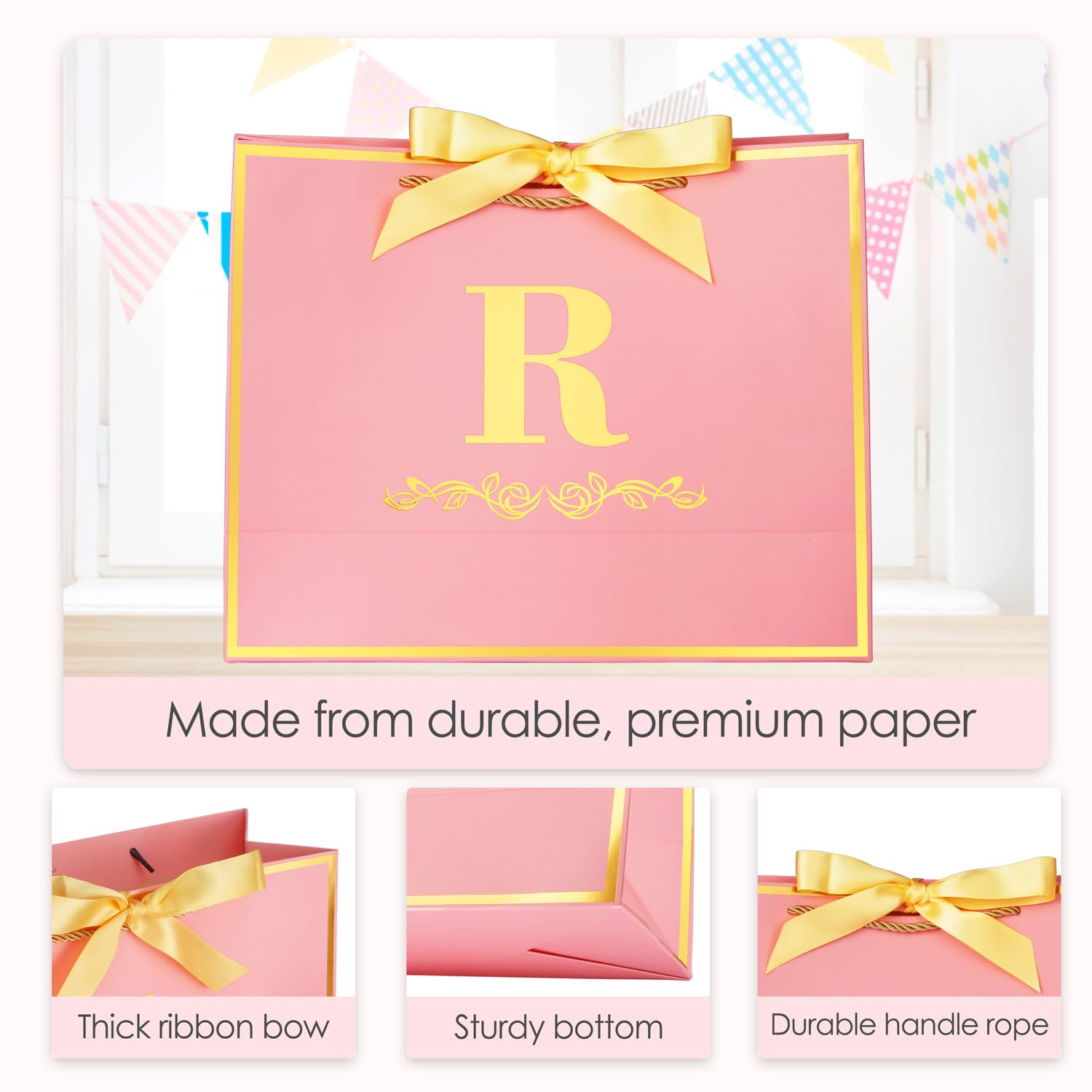Initial Birthday Gift Bag with Card and Tissue Paper for Women/ Her, 13" Large Pink Gold Personalized Alphabet Bag for Women, Bridal Party Gift Paper Bow Gift Bag for Gifts Wrapping