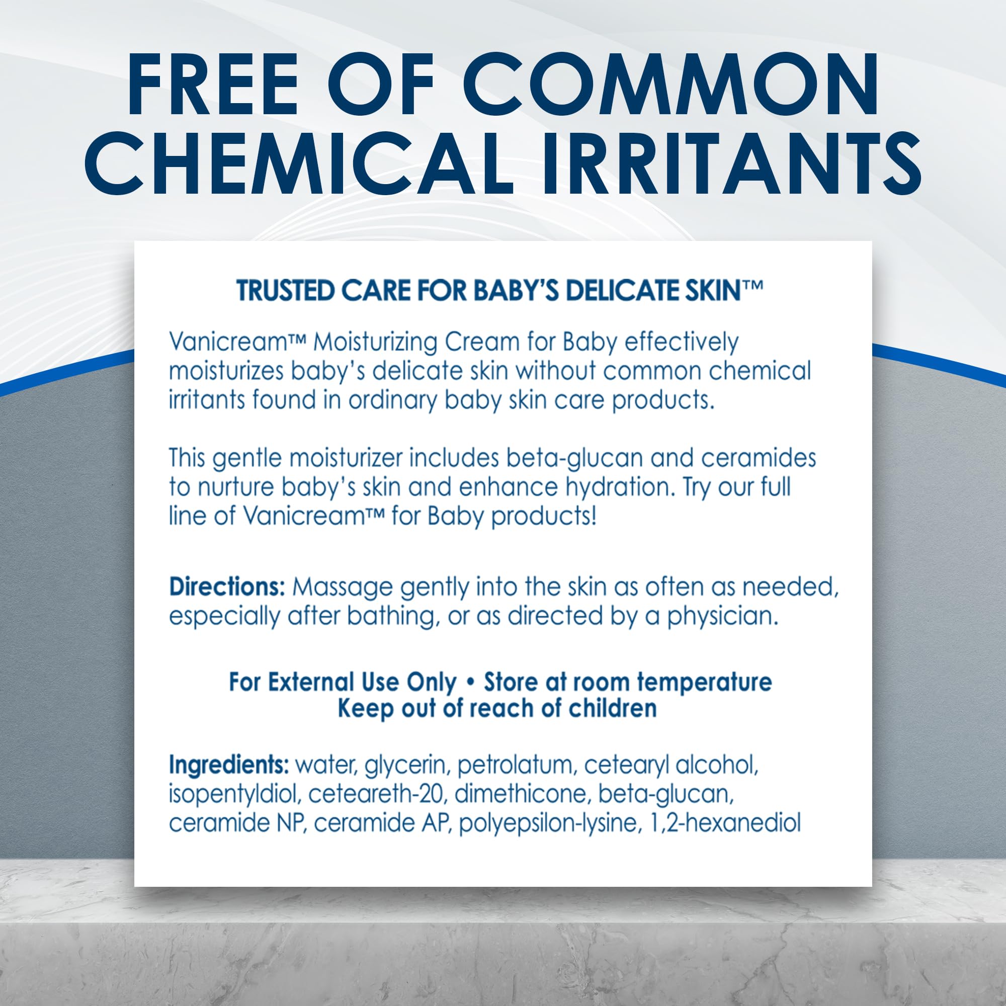 Vanicream Moisturizing Cream for Baby with Ceramides & Beta-Glucan Vanicream Moisturizing Cream for Baby is a gentle, dermatologist-tested formula designed to hydrate and protect your baby's delicate skin. Enriched with beta-glucan and ceramides, the pH-balanced formula supports the skin's natural barrier and enhances hydration. Free from common irritants like dyes, fragrances, lanolin, parabens, botanical extracts, and formaldehyde releasers, this moisturizing cream is suitable for babies with delicate skin. With a gluten-free formulation, this baby lotion ensures safe, daily use for children of all ages. Apply gently to your baby's skin as often as needed, especially after bathing, to maintain softness and comfort throughout the day. Trust Vanicream, the #1 Dermatologist Recommended Brand for Sensitive Skin*, for your baby's skincare needs. With over 50 years of expertise, our primary purpose is to make products for people with sensitive skin. *Source IQVIA ProVoice Survey, 12 months ending July 2024. Packaging may vary.