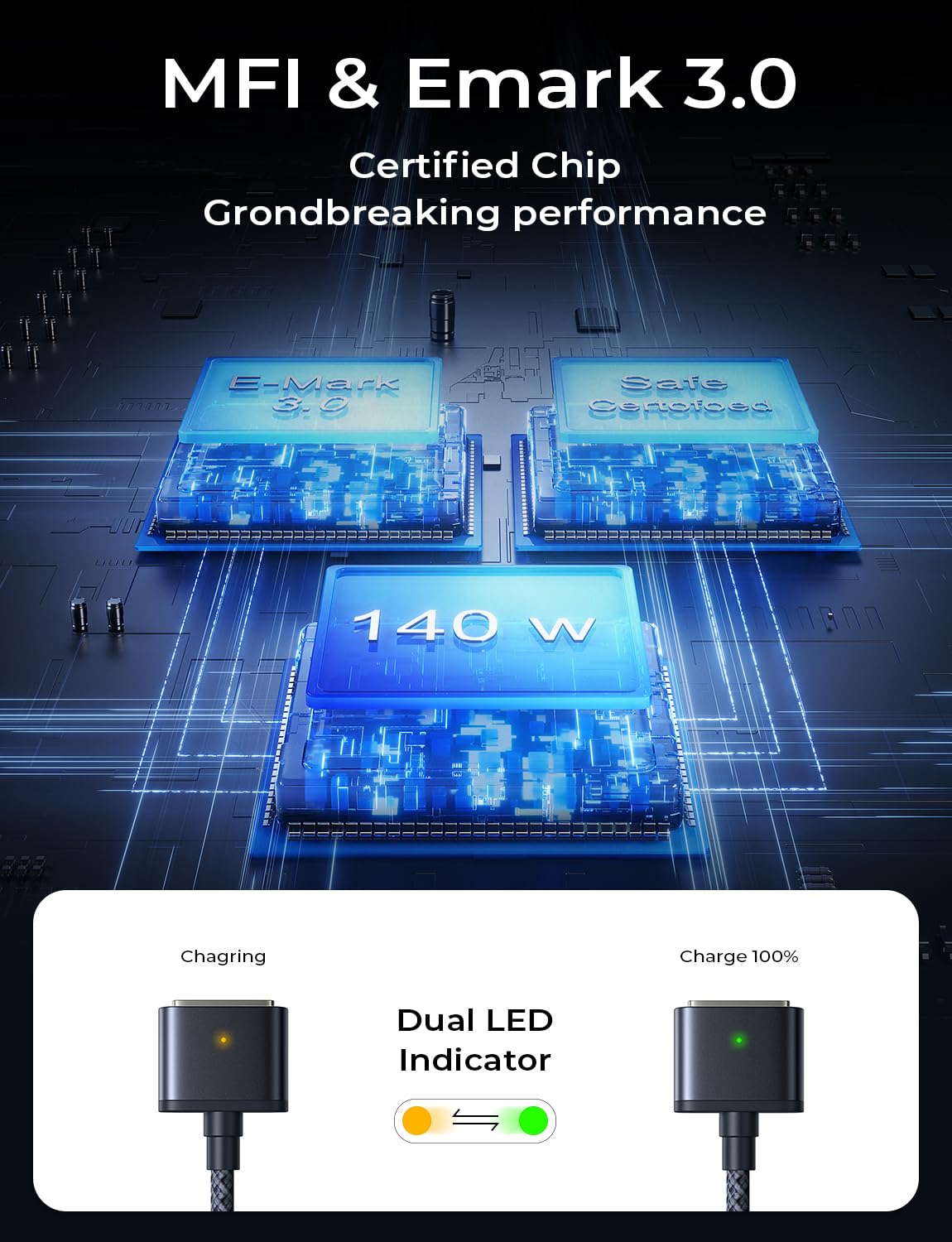 140W PD 3.1 Super Fast Charging: This Magnetic Gen 3 charging cable delivers 140W PD 3.1 super fast charging speed as OEMs, this macbook pro charger cord powers your MacBook efficiently with a 96W or 140W adapter, reaching 50% in just 30 minutes. NOTE:While using certain power adapters, a slight 15-20 second delay in the charging process might occur due to our magnetic safety mechanism, but rest assured, it's a sign that your laptop is being well-protected