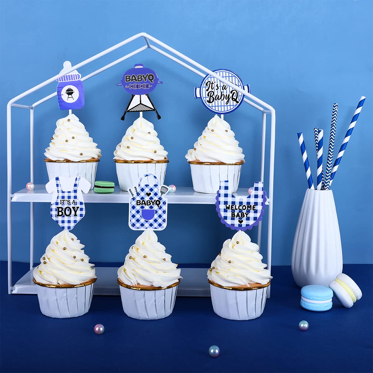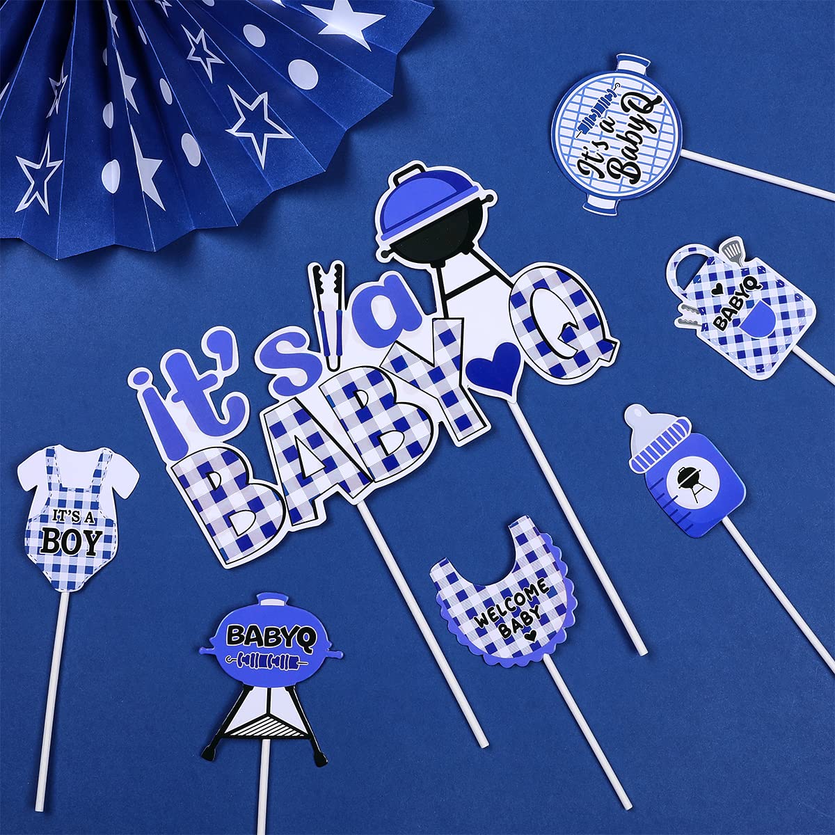 The babyq cupcake toppers are cute and exquisite, and they are nice decorations for your parties. Package Include: 1 pcs big It's a Baby Q cake topper 24pcs bbq themed cupcake toppers Color: Blue