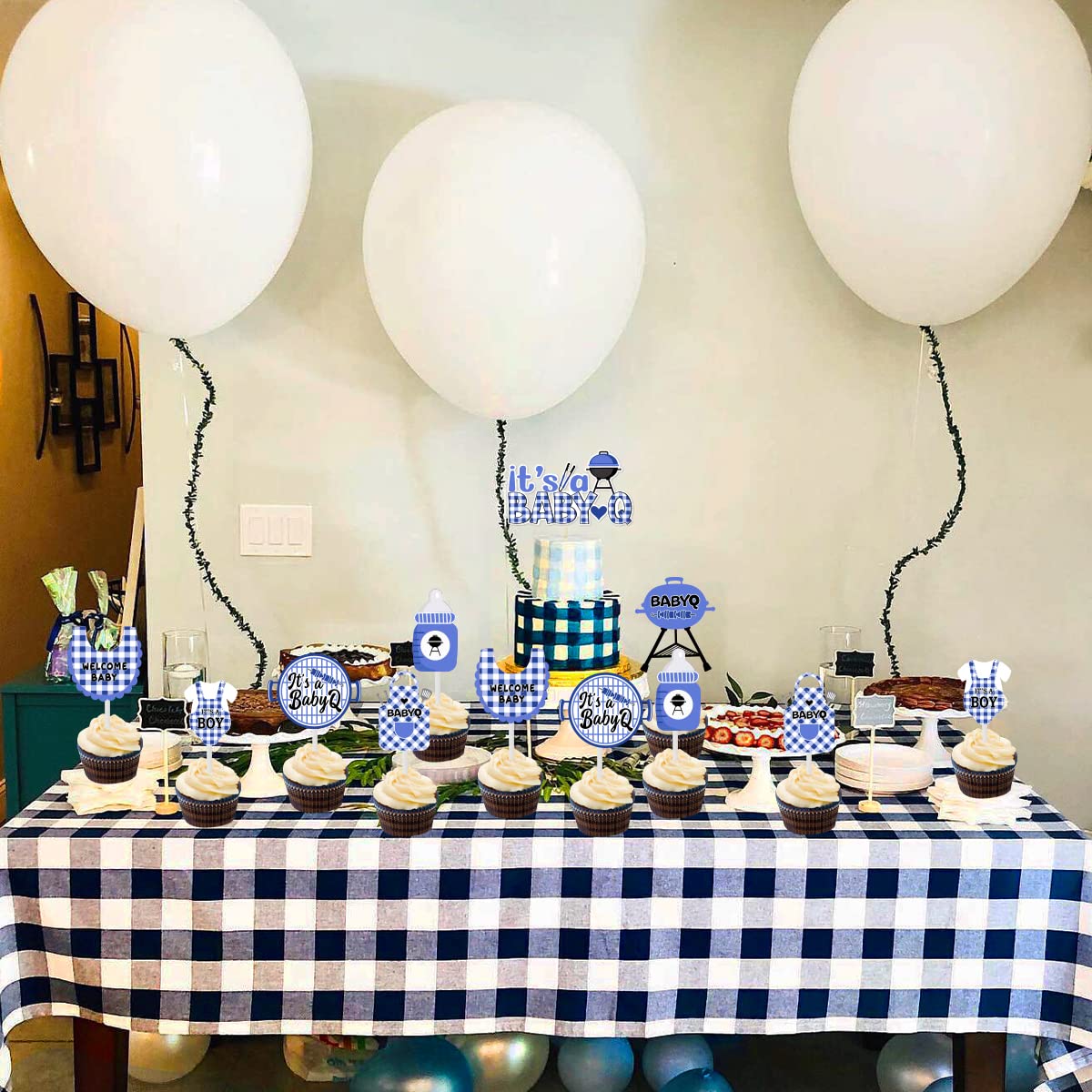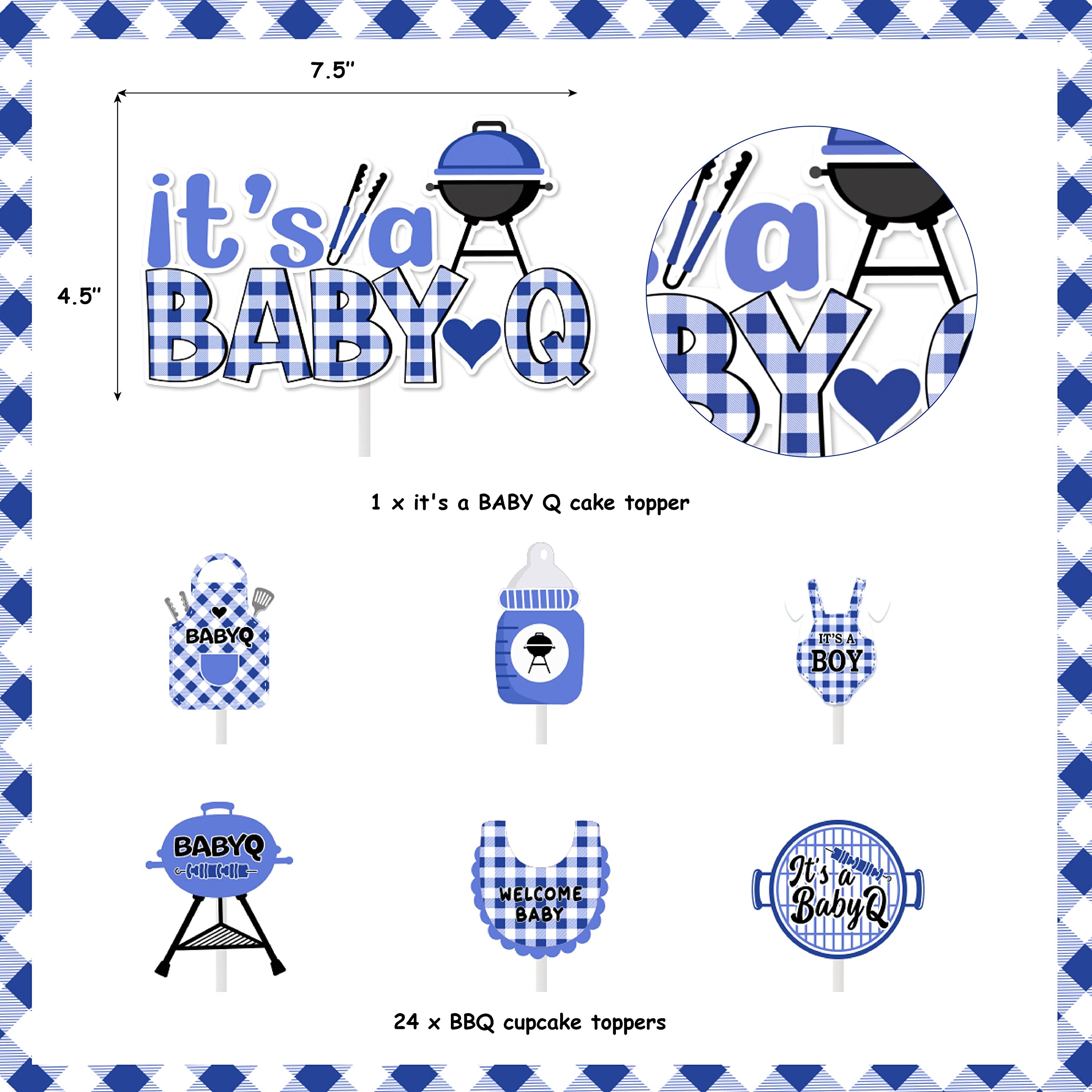 Bbq Baby Shower Cake Toppers: You will get 1 pcs big It's a Baby Q cake topper, 24pcs bbq themed cupcake toppers (6 different elements, each one is 4pcs). It will be a good cake decorations for your baby shower cake.