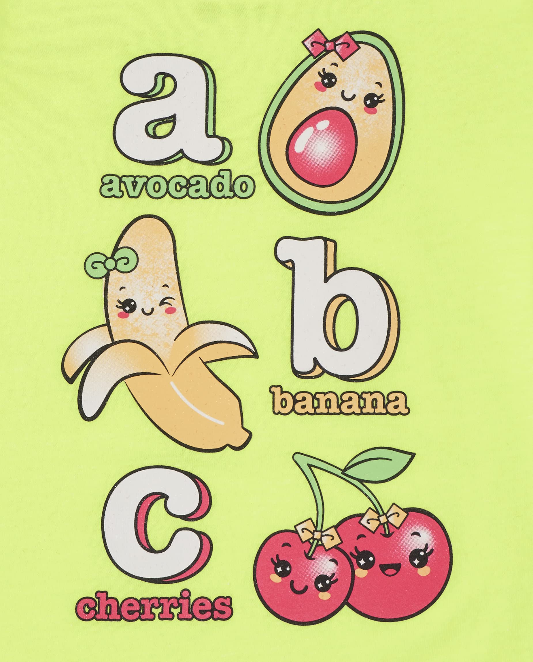 Pack of 3 graphic tees includes: 1 graphic tee with 'Avocado' 'Banana' 'Cherries' and fruits graphic design at front; 1 graphic tee with 'Square' 'Triangle' 'Circle' 'Star' 'Rectangle' and shapes graphic design at front; 1 graphic tee with 'One' 'Two' 'Three' graphic design at front