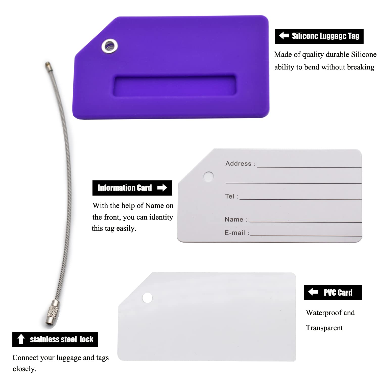 【Flexible & Durable】Our luggage tags Made of quality durable Silicone ability to bend without breaking. The reinformed metal hoop will ensure that your bag tags will be attached to your belongs all the time.