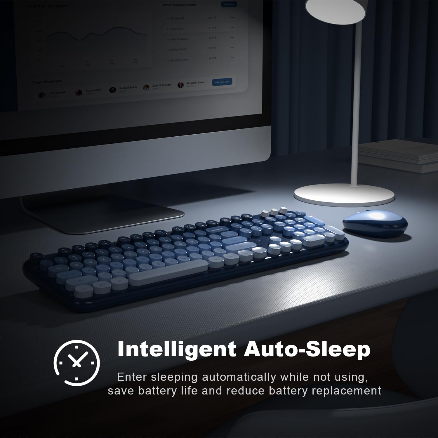 【Automatic Power Saving Functionmode】If you don't use the keyboard for more than a minute, the keyboard will auto-enter the sleep mode to save power, which greatly prolongs the battery life, Click any key or button to wakes up within 2 seconds, If one day the keyboard suddenly does not work, please replace the battery and try to use it, when the battery is dying, the low battery indicator on the keyboard will remind you to replace the battery.