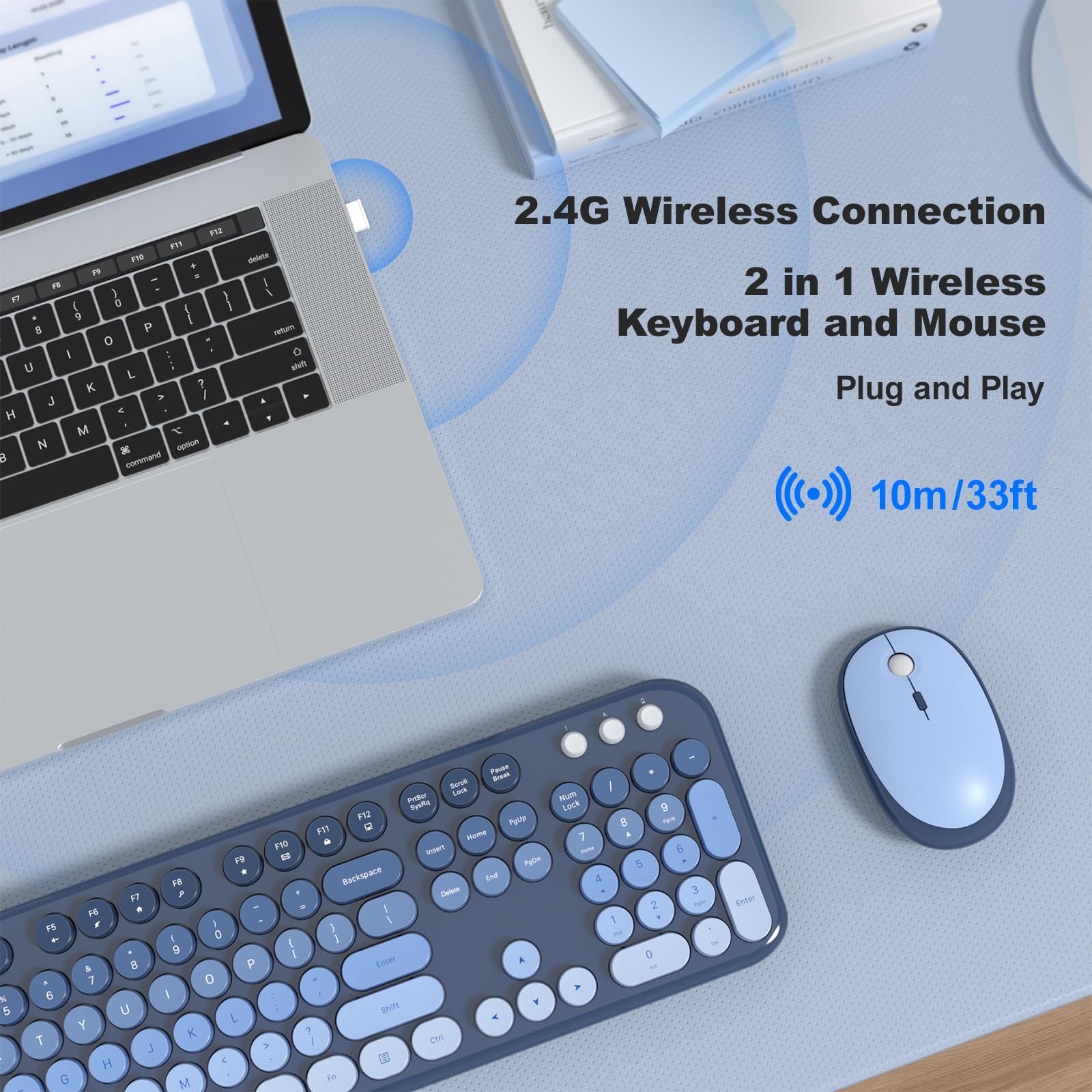 Fashion Multi-color Wireless keyboard and Mouse Combo- Enjoy Wireless Freedom. Stable wireless connection 2.4G wireless Keyboard and Mouse provides a powerful and reliable connection up to 10m(35 feet) no any delays. This wireless keyboard adopts a mixed-color design, using Laser printing, the letters on the keycaps will not easily blur or fall off. All 104 Keys non-conflict. Specifications: Transmission distance: 10m/35ft Package Included: Wireless Keyboard x 1 Wireless Mouse x 1 USB Nano receiver x1 User manual x 1