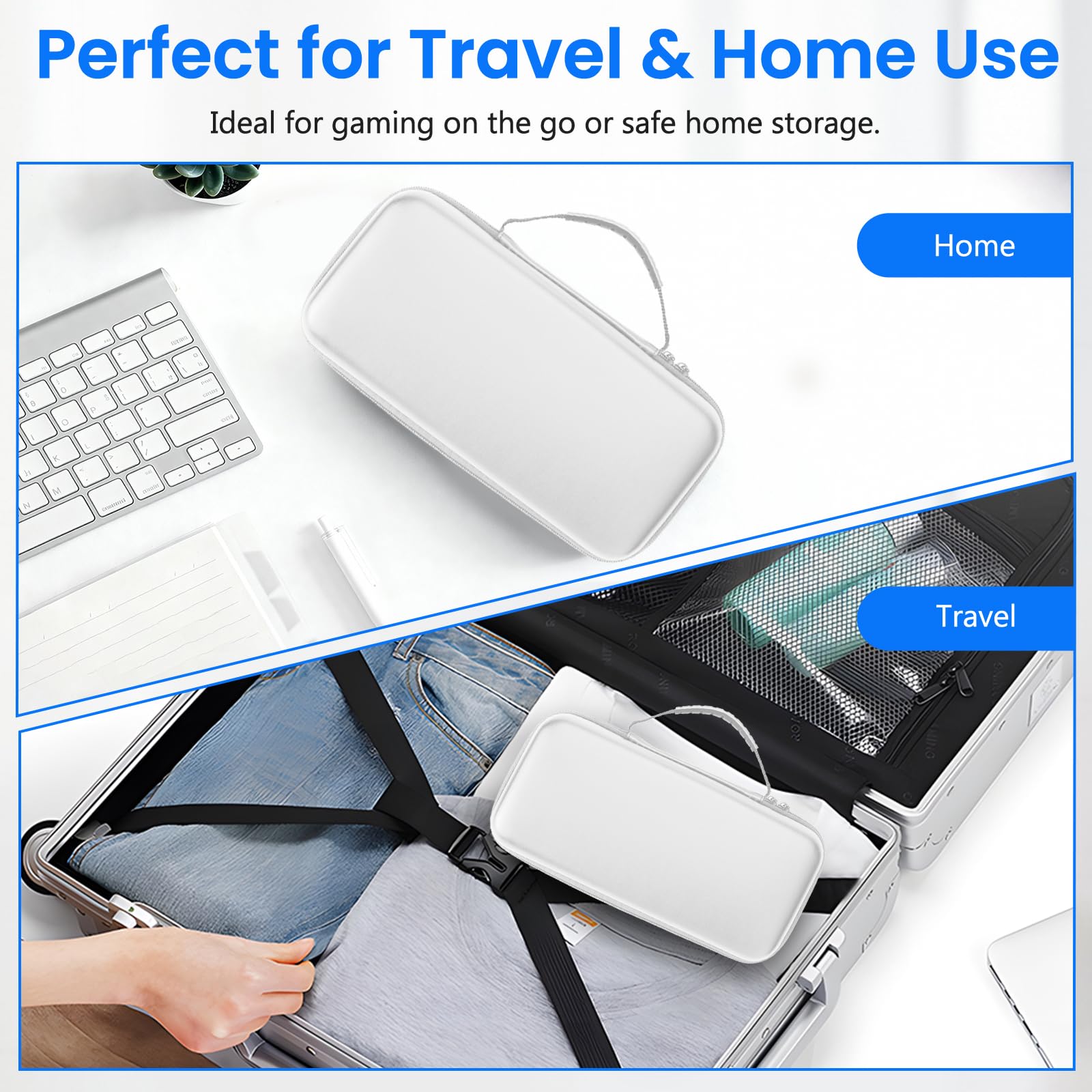 Keep your handheld console safe and organized with this premium carrying case. Designed with gamers in mind, this travel bag combines protection, style, and convenience in one durable package. Made from PU leather and EVA material, the case provides a strong, shockproof exterior while maintaining a sleek and modern look. The textured PU leather is not only stylish but also water-resistant, ensuring your device stays protected from splashes and light rain. Inside, the hard EVA shell keeps your console and accessories safe from impacts, scratches, and dust. The case is equipped with a sturdy handle, making it easy to carry whether youâre commuting, traveling, or heading to a friendâs house for a gaming session. With dedicated storage compartments, you can neatly organize your console, charging cables, and other small essentials, preventing clutter and damage. Compact yet protective, this carrying case is the perfect solution for safe storage and portability. A must-have accessory for gamers who want to protect their device in style.