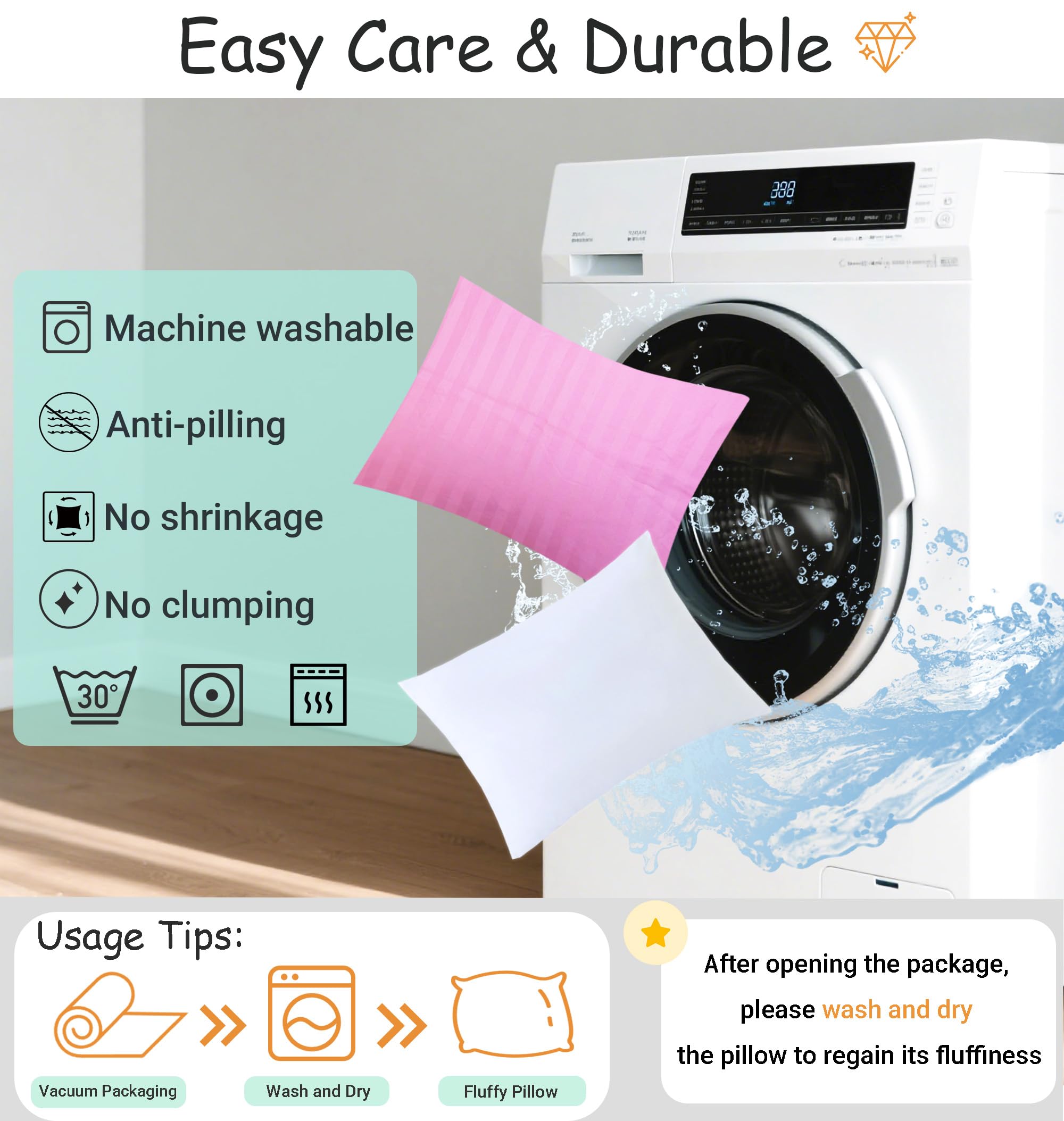 EASY CARE: Machine washable and tumble dryable; no shrinking, pilling, and clumping, sun-cure your pillows regularly to keep them fluffy