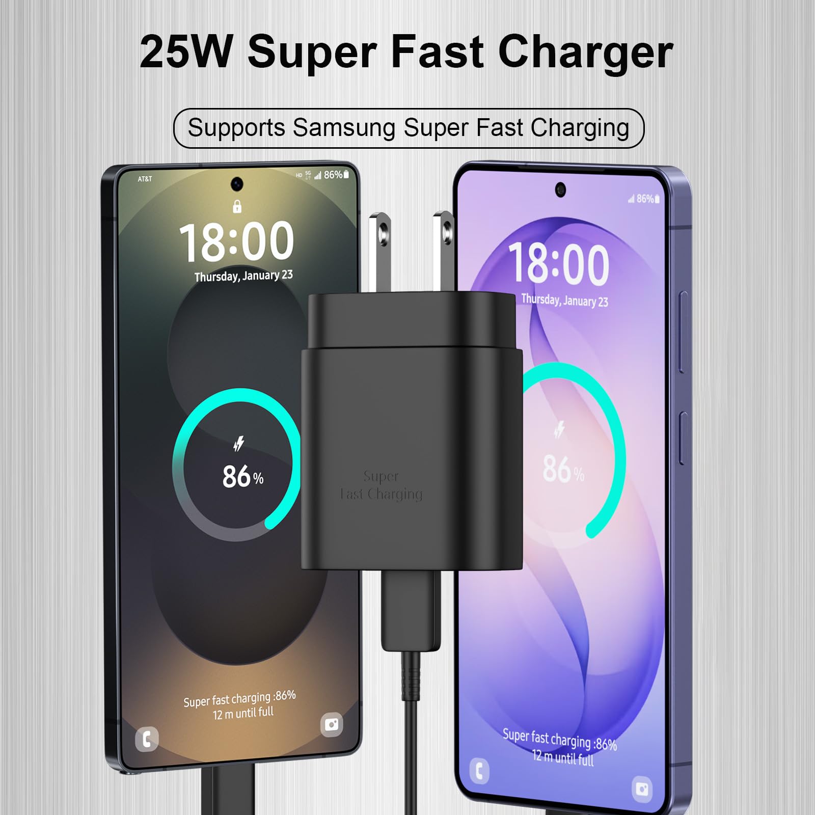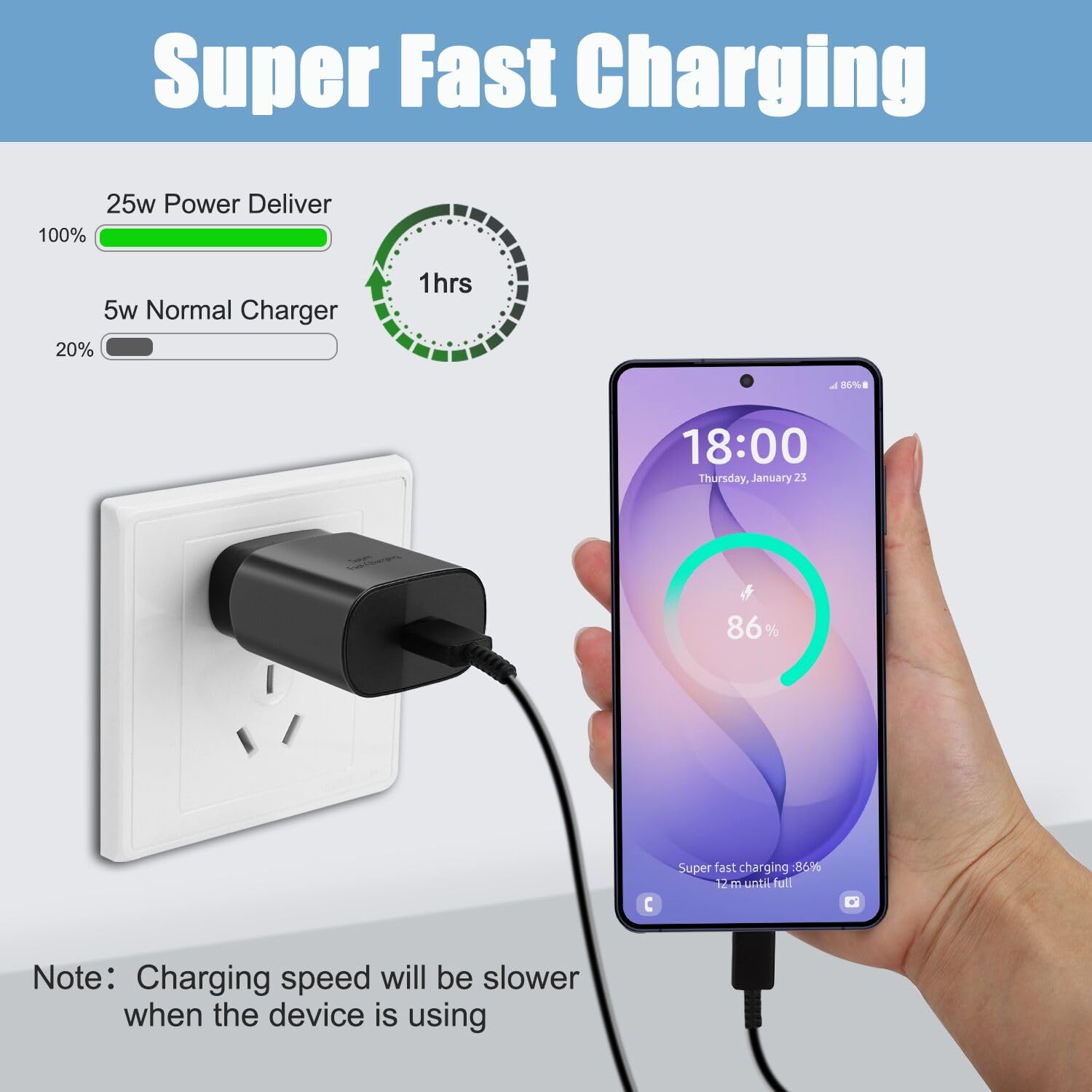 【Safety Super Fast Charger Type C】25W PD 3.0 Technology provides Max 25W output power for all Samsung Galaxy S25/S25 Ultra/S25+/S24/S24 Ultra/S24 Plus/S23/S23 Ultra/S23 Plus/S22/S22 Ultra/S22+/S21/S21+/S21 Ultra/S20/S20+/S20 Ultra,this Samsung fast charger type c kit fast charge your battery from zero up to 100% in about 60 min,5 times as fast as Standard Charger Block,10 times as fast as PC USB port and saves you time