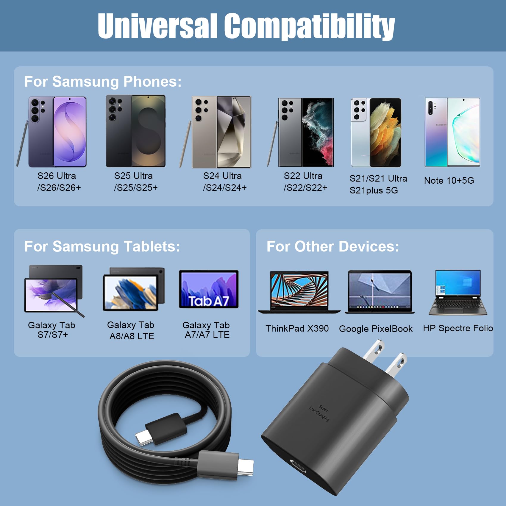 【Samsung Super Fast Charger Compatibility】The USB C fast wall charger cable kit supports most of most of USB C devices, including Samsung Galaxy S25/S25 Ultra/S25+/S24/S24 Ultra/S24 Plus/S23/S23 Ultra/S23+/ S21/ S21+/ S21 Ultra 5G/ S22/S22+/S22 Ultra/Note10/ 10+, Note 20/20 Ultra 5G, S20/S20+/S20 Ultra 5G/ S20 FE(Fan Edition) 5G, S10, S10+, Galaxy Z fold 3/ Galaxy Z Flip 3,S10e, S9, S9+ Plus, S8, S8+ Plus/Active