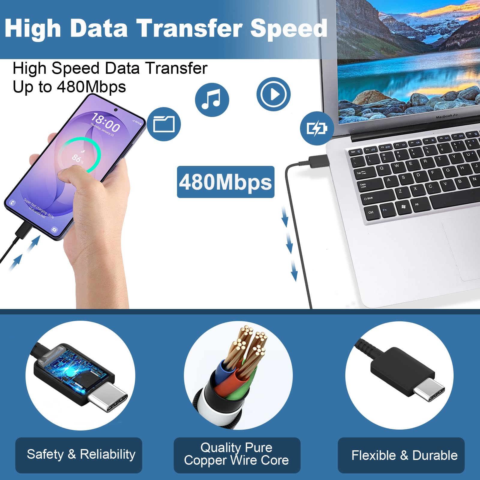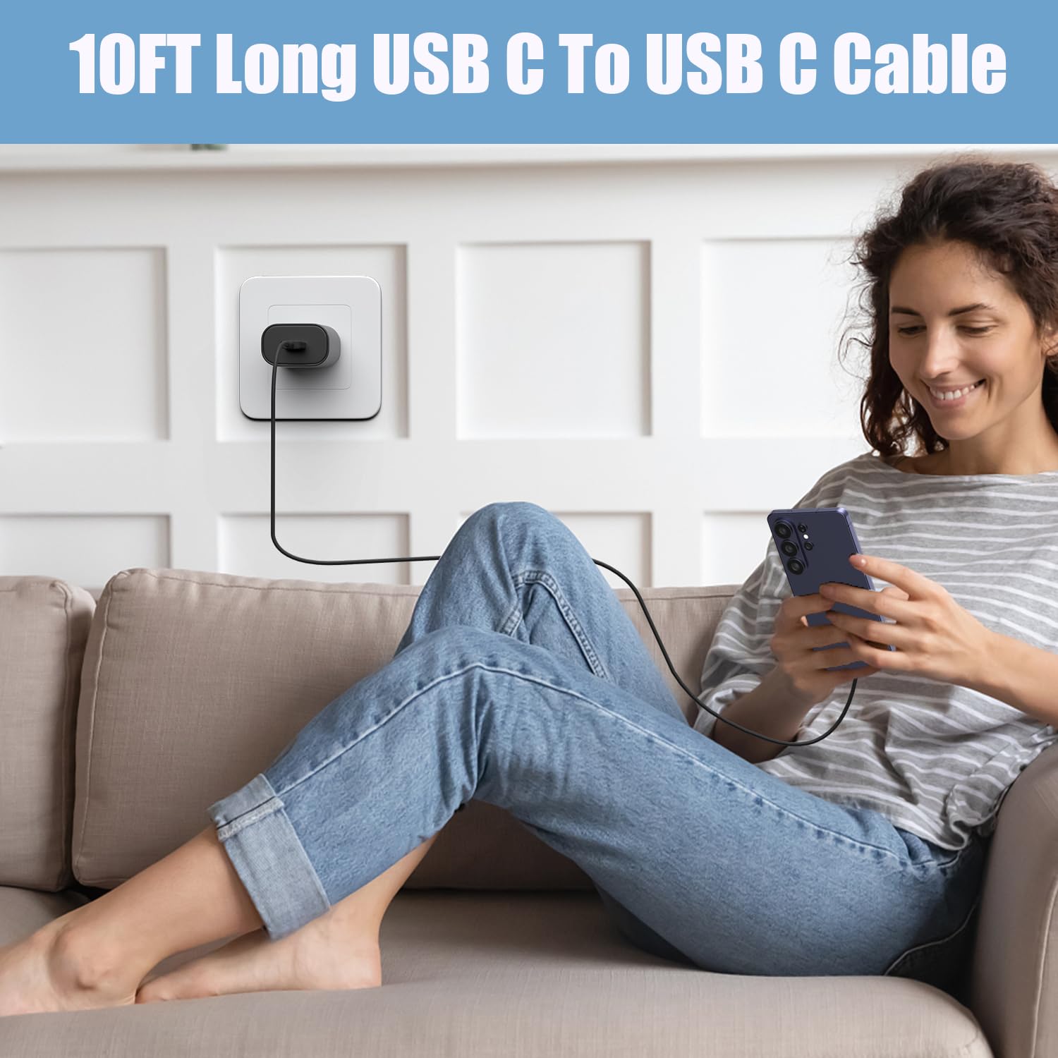 【10 Feet C Cable Cable Fast Charging】25W Super fast charger type c kit includes 10 feet/3m super long type c to type c cables,allows you to charge your Samsung phones and other usb-c devices from extra long distance, and freely enjoy playing games while super fast charging.Output 3A high power and supports data transfer speed up to 480Mbps.